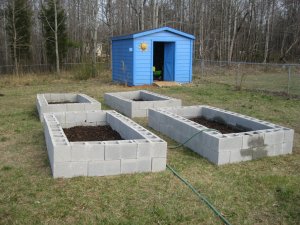 Blocks all stacked, cardboard layer on the bottom, home grown compost scattered around, pine mulch layer spread and watered.