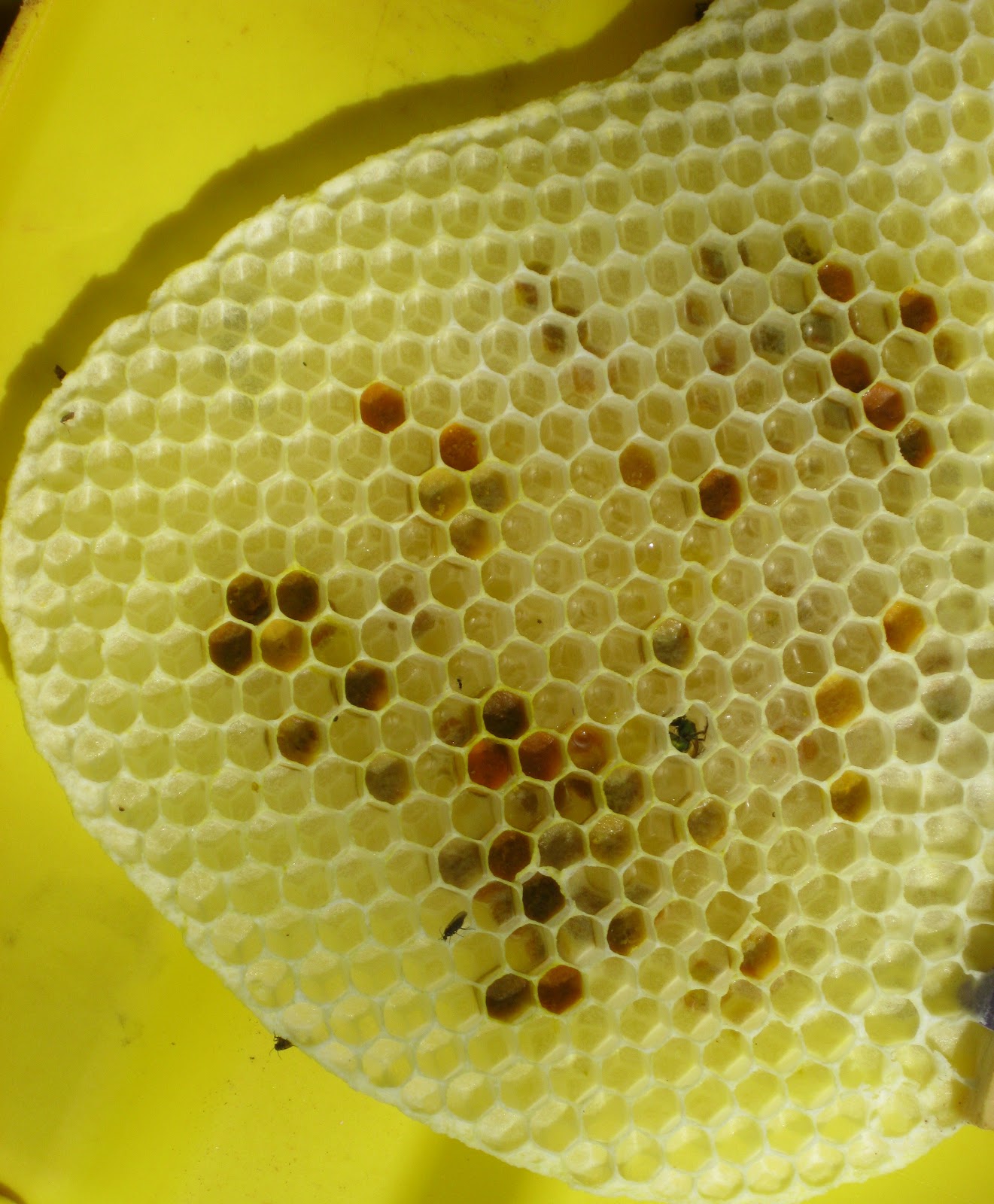 (The little bugs in a couple of the chambers were taking advantage of the situation after the comb was moved outside, not problems for the hive.)