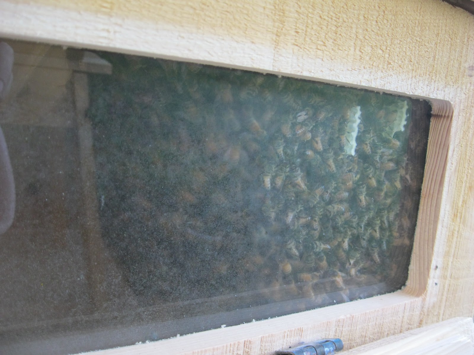 When I checked the syrup status last night, Rosamund had about half a quart and Lucretia had 2/3. I had some syrup left from yesterday’s feeding and added it to Rosamund’s jar this morning. Also, I moved the back board back one bar. It was originally behind bar 10. The cluster is back to bar 7 so they have plenty of free space to move into. Lucretia’s cluster only goes back to 6 and isn’t as full or attached, yet.