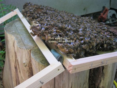 They didn’t get grumpy until we were taking the second comb out. They were surprisingly patient as we got started. And by the end, we were too busy to pay attention to their temper tantrums. We even let the smoker go out and forgot all about it. Never saw a queen, but Randy has at least 3 queen cells in the frames.