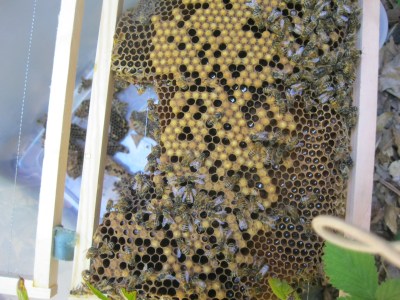 Randy took 2 boxes of comb with brood, pollen, honey and at least 3 queen cells back to his bee yard. Plus a couple of packages of bees in the vacuum box.