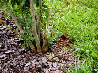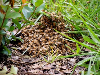 Found some wet cranky bees in the mulch this morning, below the bush where the swarm was last night.