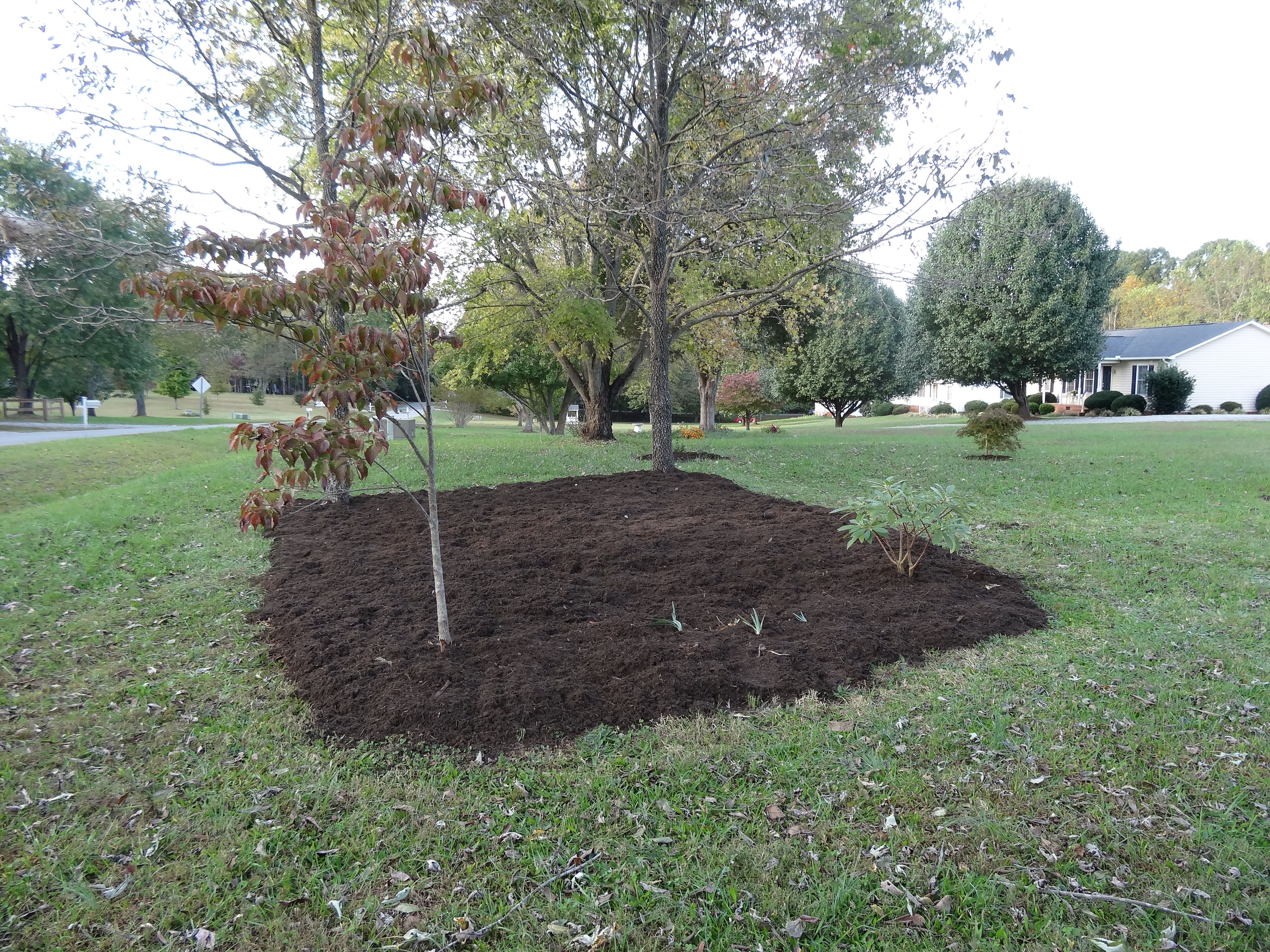 We had some mulch that wasn’t needed a couple of years ago and we dumped it between 2 smallish plants, killing the grass and acting as a test run for grass-killing-with-mulch. It was effective so we expanded the spot. It took 4 trips to the mulch store to get 6 scoops of hardwood mulch to do it. We intend to do more, but it’s a good start and gave me a place to plant the flowers I had been offered.