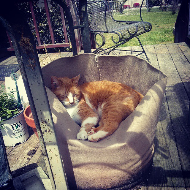 In the mean time, we have used dirt from the other bag for potting plants for various projects. Herbs for friends, filling in around other plants, whatever. And my cat has discovered the joys of sleeping in a bag of dirt. It’s pretty funny to see him curled up in there, snoozing.