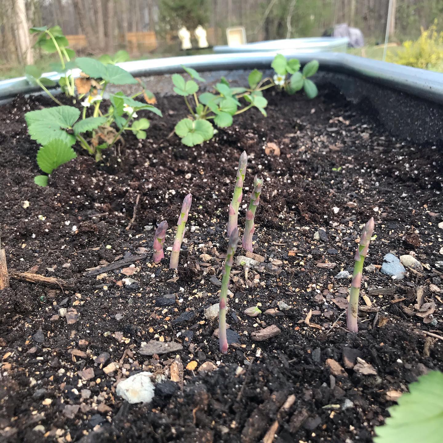 Last year, I read that strawberries and asparagus grow well together. The strawberries keep the weeds out of the asparagus bed and the asparagus ferns shade the strawberries through the summer heat. Yesterday, I picked up some strawberry plants and found as a delightful surprise.