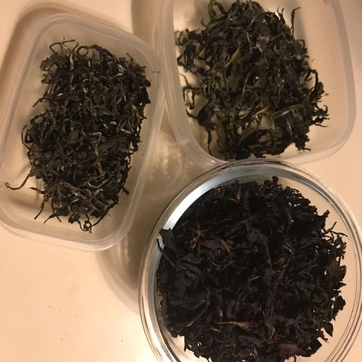We came home with some steamed green, some pan fired green, some black and some raw tea leaves that were part of what we had picked that morning. Chuck dried the 3 prepared teas in our oven and he made a small batch of black the next day with the leaves we had brought home. We have 2 small containers of green tea and about 2 cups of black tea ready to go.