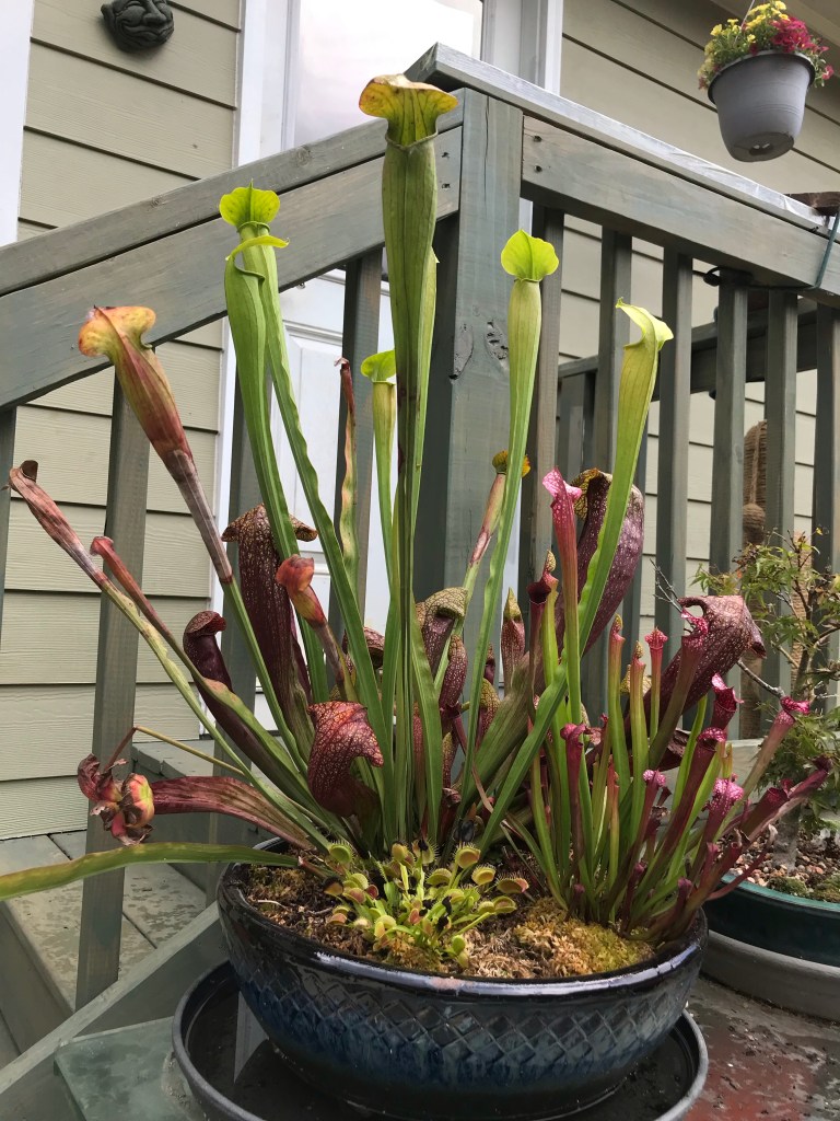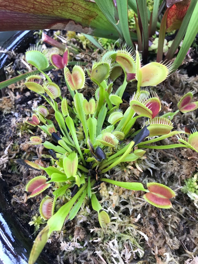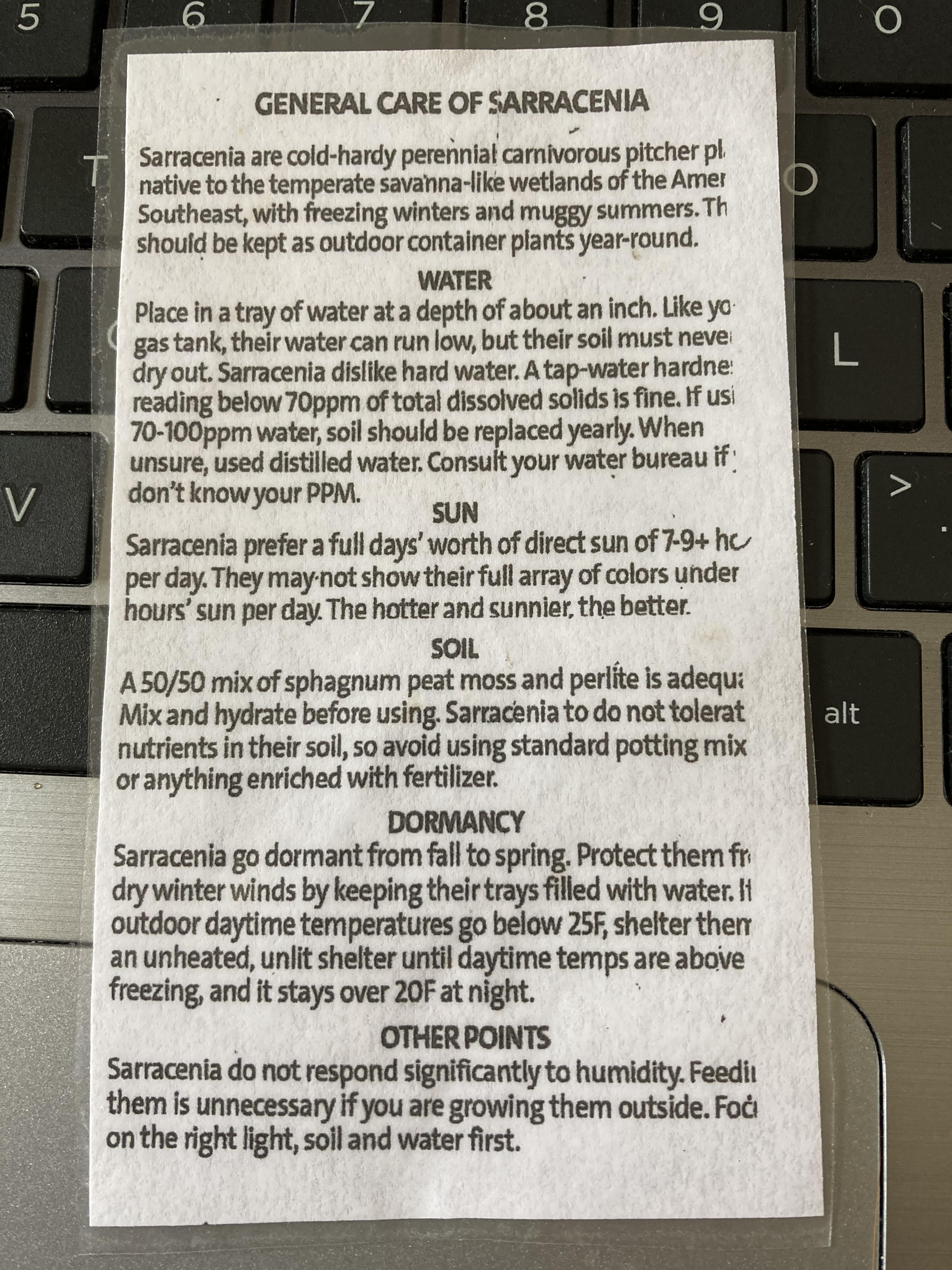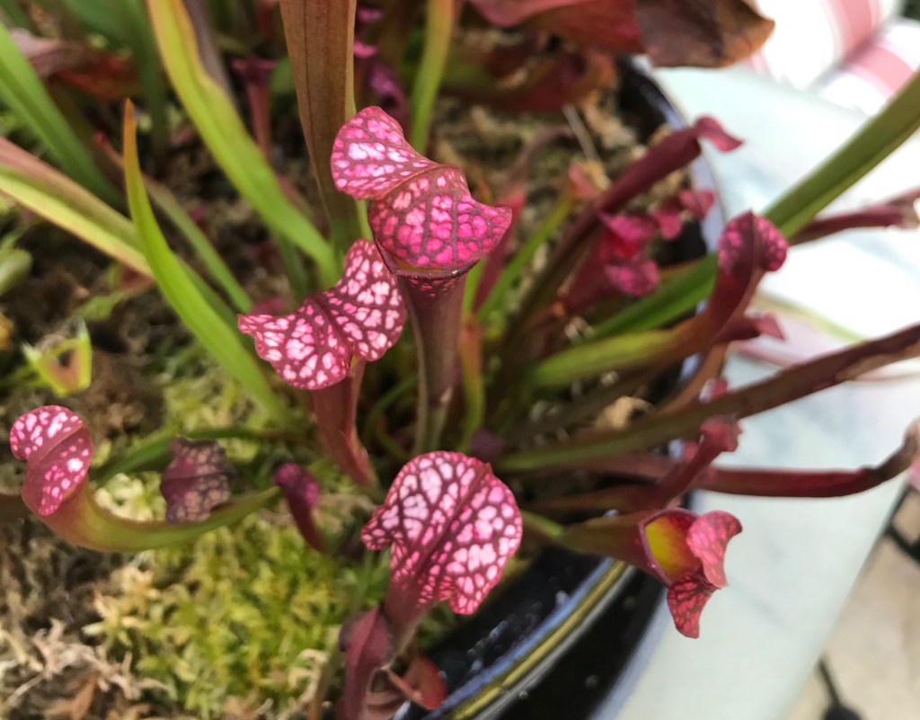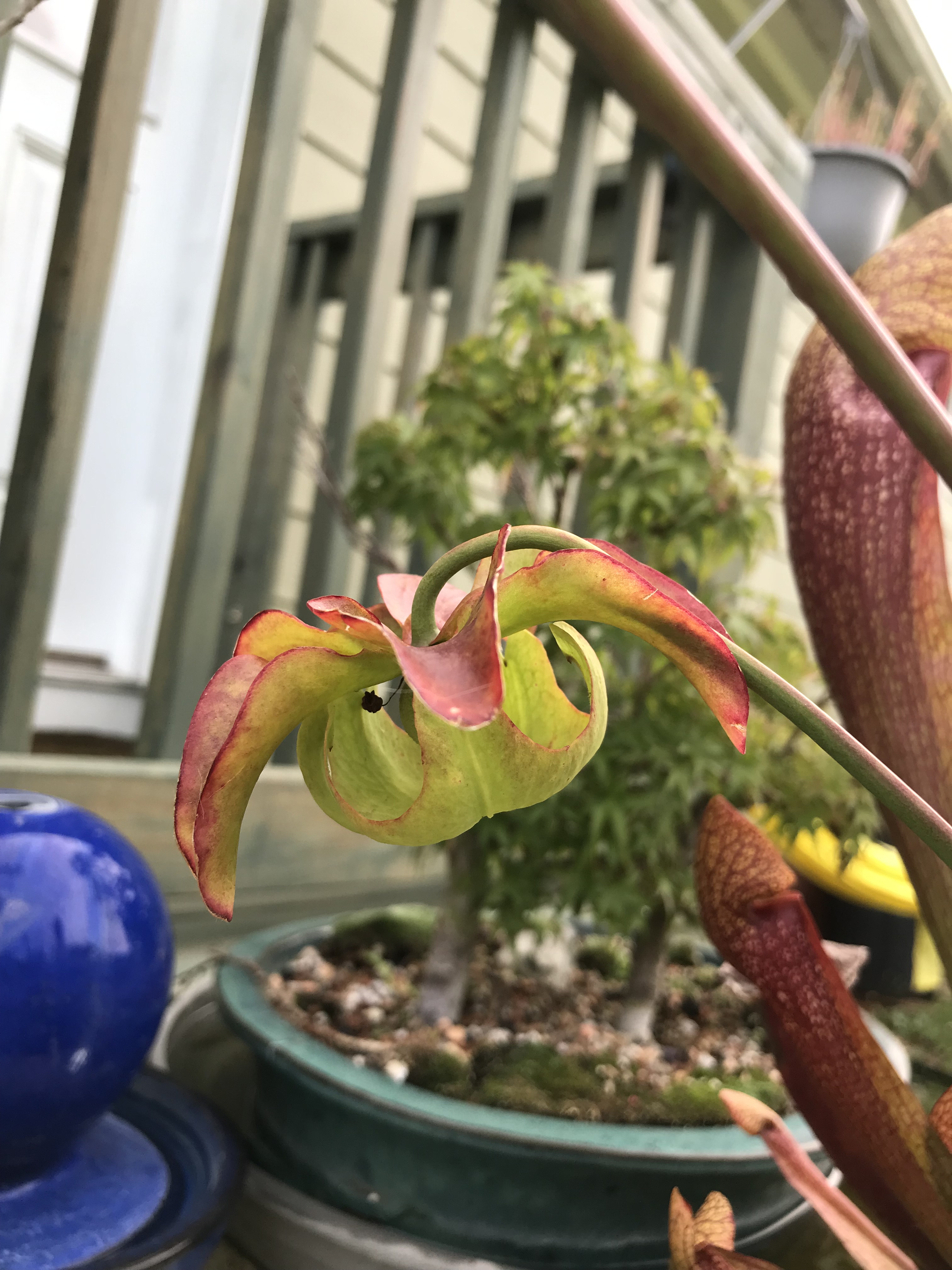 She told me to keep their feet wet (they are bog plants), leave them outside all year (they are native to our part of the world), don’t freak out when they die back in winter and don’t bother to feed them. Particularly, don’t fertilize them. They get nutrients from the insects they trap and, if you fertilize them, they don’t need those nutrients and don’t bother to make traps.