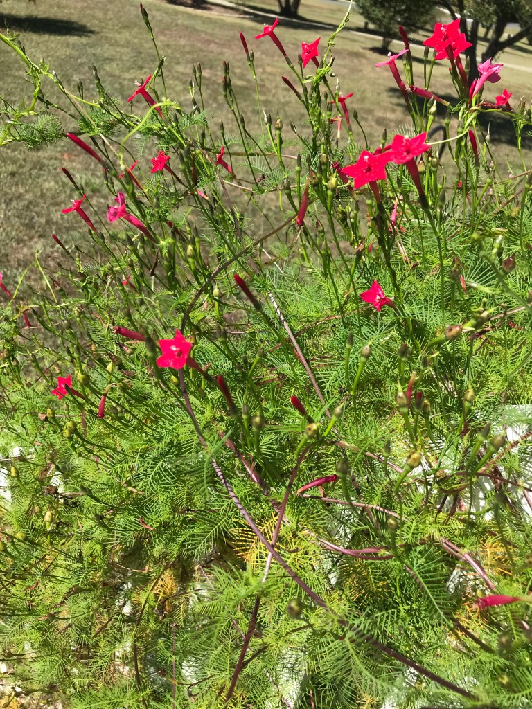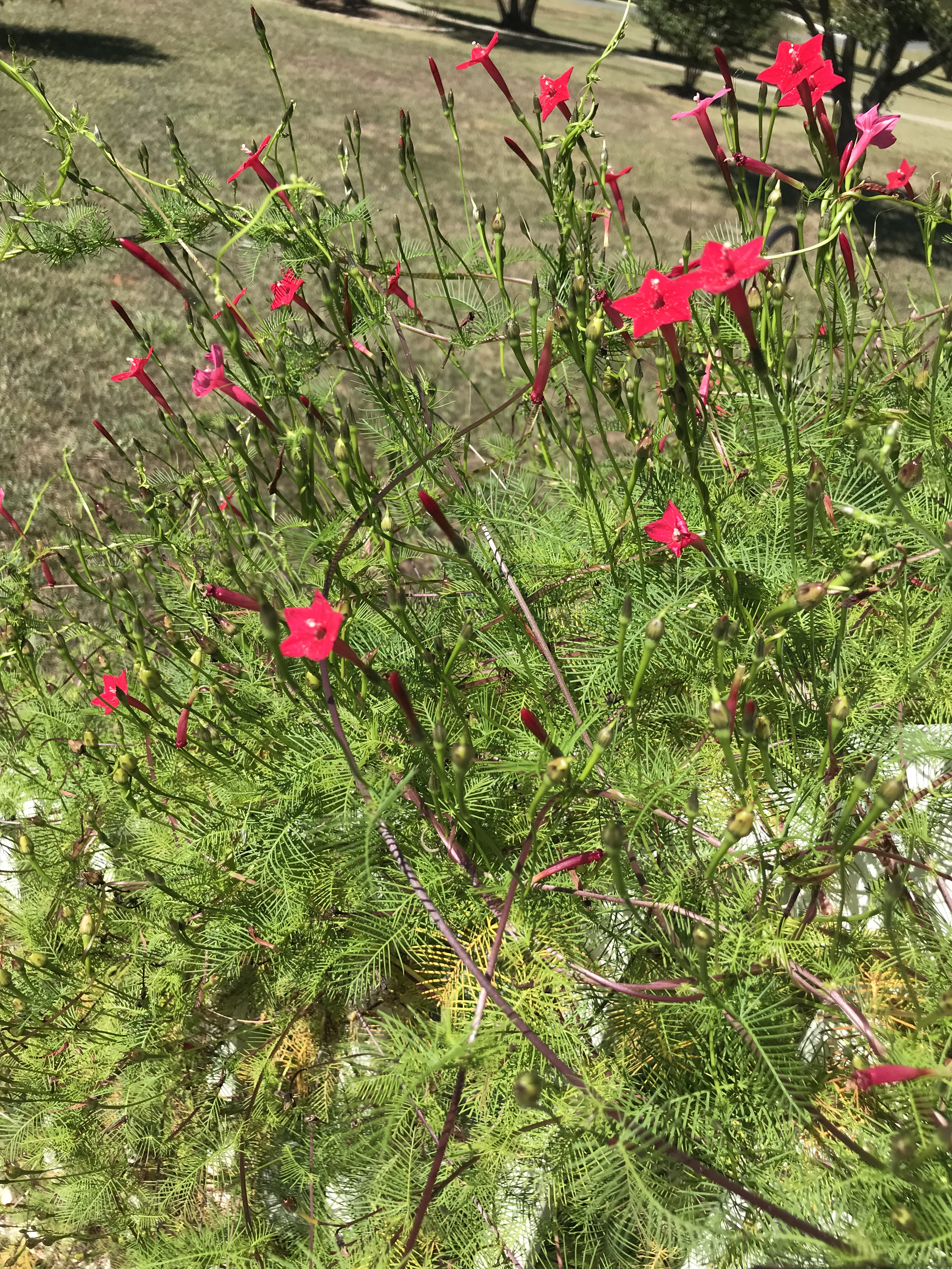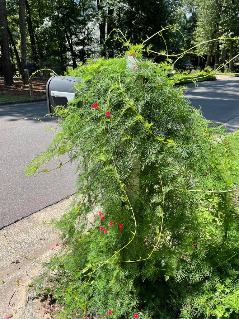 I have been sprinkling cypress vine seeds by the fence on the left side of the back yard. It’s been coming back very consistently since I planted it by the stoop several years ago and the hummingbirds love it. It reseeds itself; it’s not perennial. I gave seeds from it to a friend 2 years ago and she sent me a picture of it trying to eat her mail box.