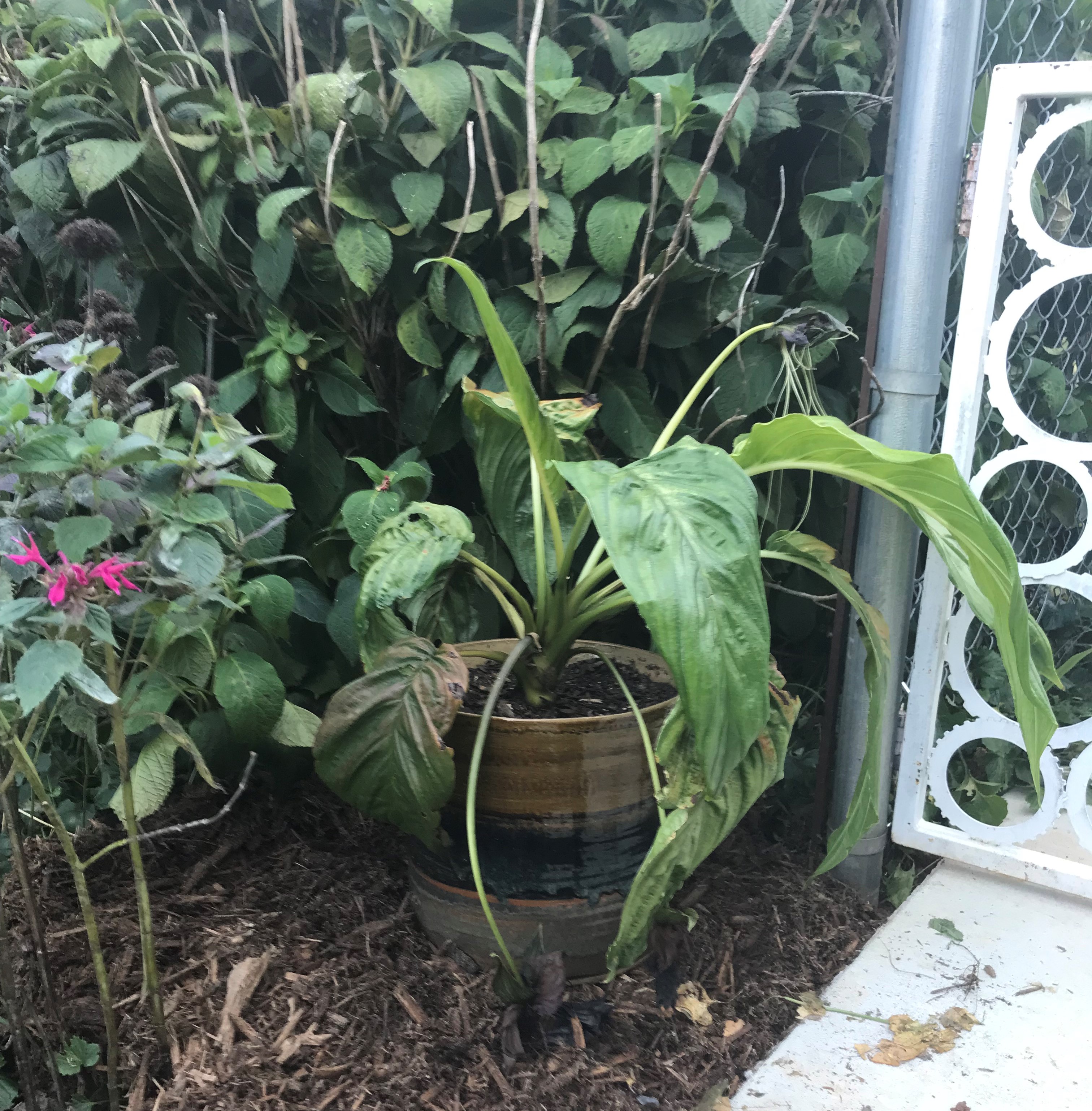 It’s going to finally start staying cool on Friday and the bat flower is going to have to come in over night. It won’t need to stay in until temps are going to stay below 50ºF every night. It doesn’t love the decreased humidity in our house. But, if I leave it out even one night of real cold, it will die. I put it in a pot made for me by a friend of my kid because we share the plant. Taylor Kennedy does lovely pottery.