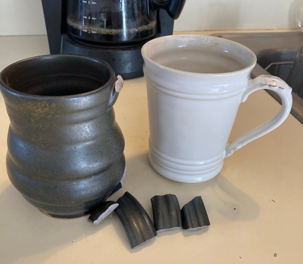 The broken mug has been my coffee cup since I got it on a road trip to Philadelphia in 2014. We stayed at an AirBnB that had inadequate coffee cups and I had neglected to bring a travel mug. As we continued northward, we saw white bicycles along the side of the highway with signs that said Farm Stand and Art and Pottery. So, we stopped at The Lion Potter near Gettysburg and I found a mug that fit my hand perfectly.