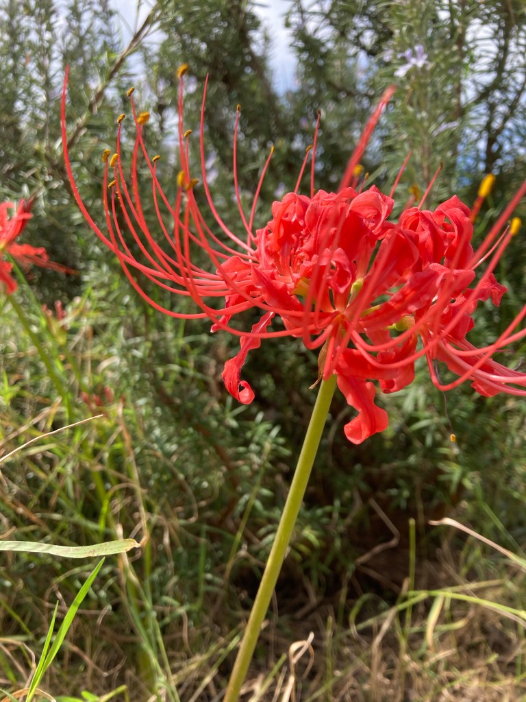 Resurrection lily, fairy lily, spider lily, naked ladies, surprise lilies. Blooming Lycoris radiata means it’s autumn.