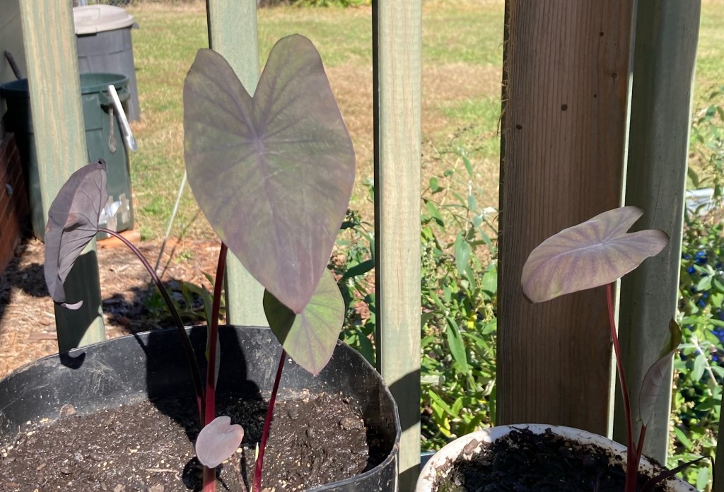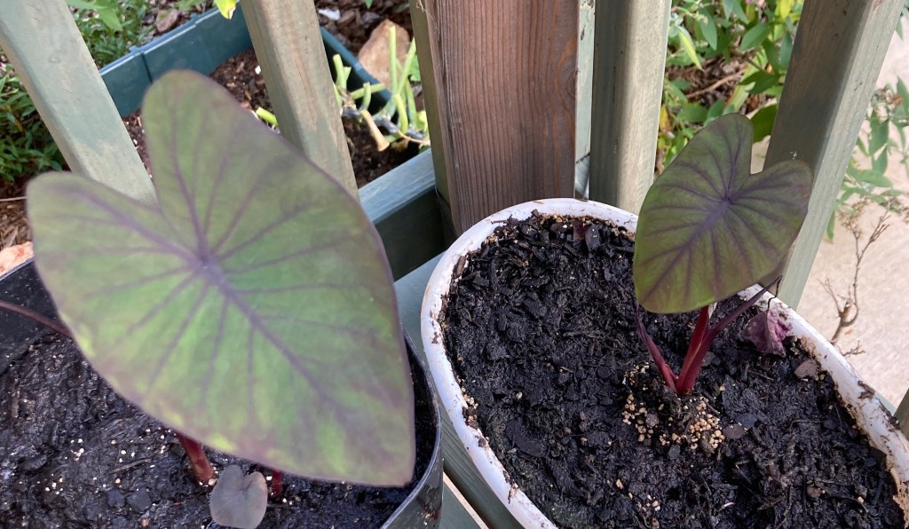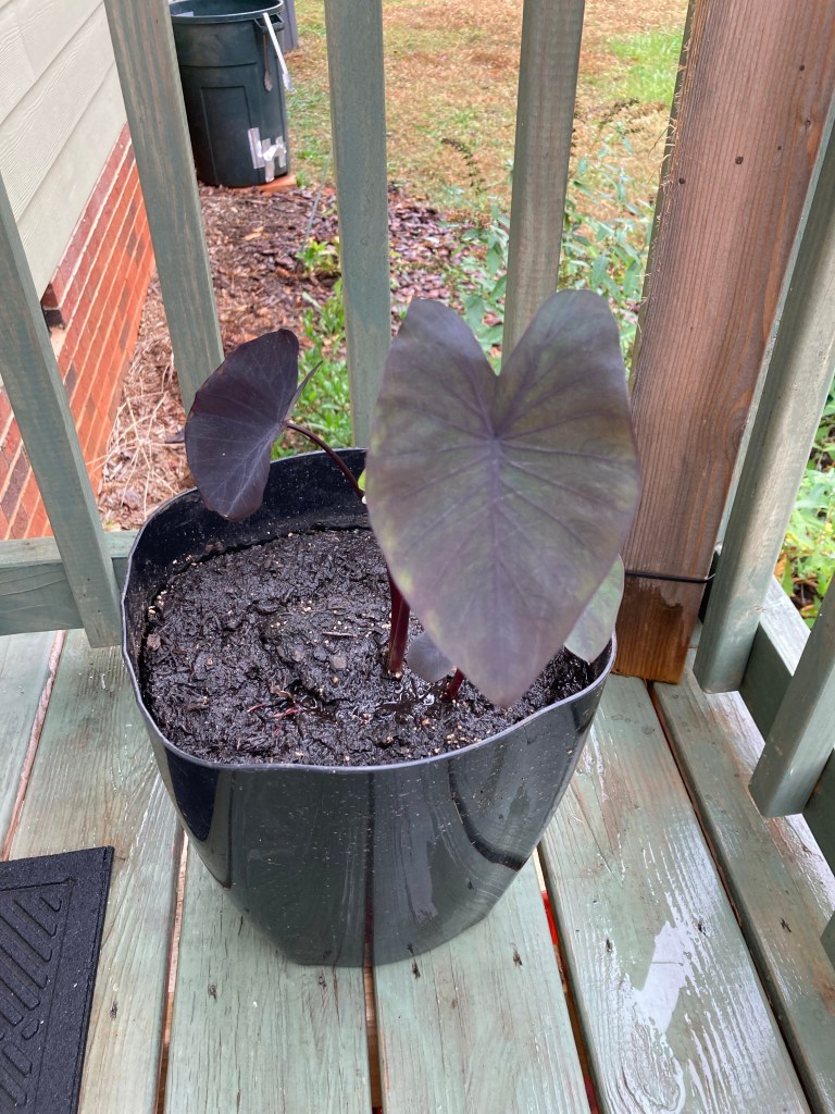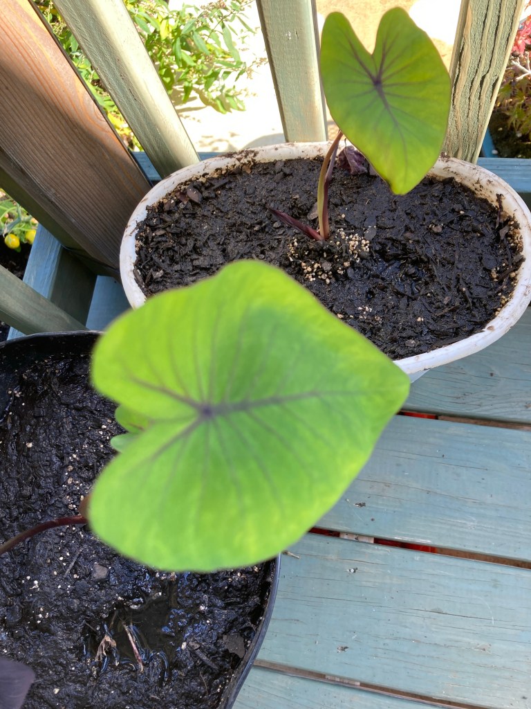 When I brought my colocasia in for the season, I split off a couple of babies to share with my cousin and my nephew. As they sat by the back door, new growth happened and, because they were in the shade, they grew green. They need light to get black. When there was a stretch of warm days, I put them on the stoop and watched them turn. I thought you’d get a kick out of this.