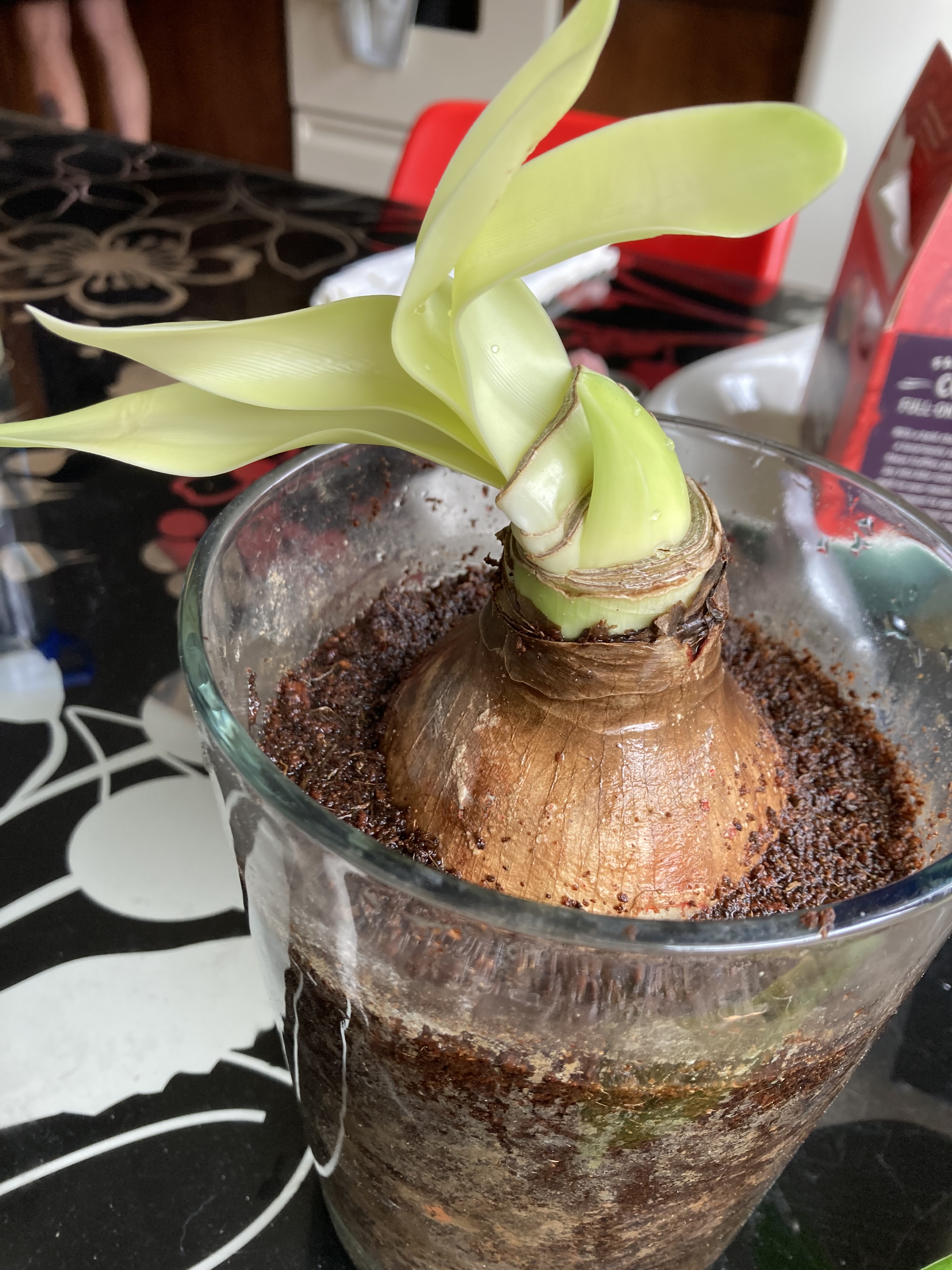 I have some glass pots that I prefer to use rather than the thin plastic one that came in the kit. As I got the bulb situated in the growing medium, I saw that it already has a bud coming up (!!!!!!) This may be a quick year.
