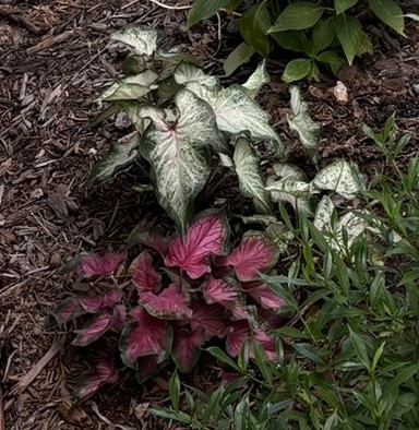 Last year, I decided I wanted some caladiums. I’d been seeing pictures of some particularly showy leaves and thought I’d see how I like them for myself. None were out yet at the garden centers. So, I got online and found a site that had some attractive bulbs for reasonable prices. And they came 2 to a package. I picked out 3. Since I’m not sure how they’ll overwinter in our climate, I put one of each in a pot and one of each in the ground.