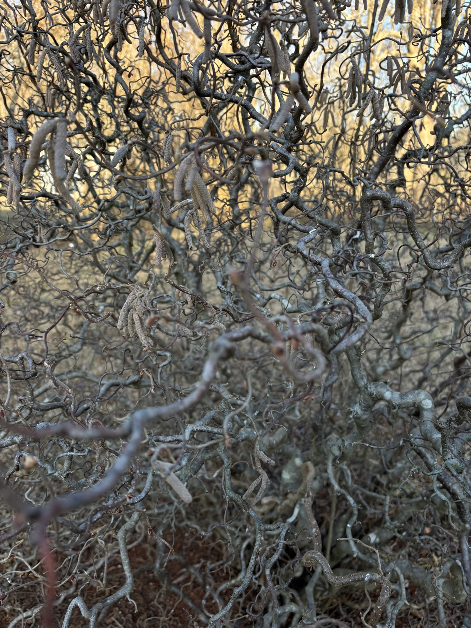 This is Harry Lauder’s Walking Stick, AKA Corylus avellana ‘Contorta’. It is a kind of hazelnut that doesn’t appear to produce a lot of nuts but does produce very twisty branches.