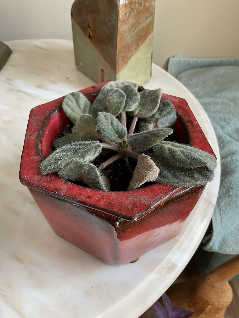 Maaaaaaaaany years later, I was having some health issues and my cousin sent me a plant basket which included an African violet. It lasted long enough for me to get a pot for it.