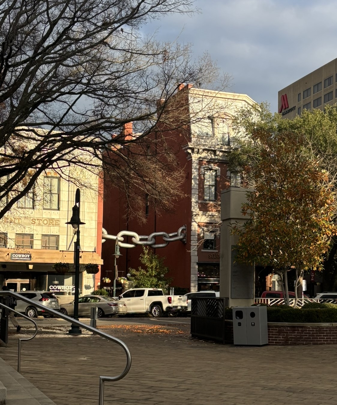 According to an article on Atlas Obscura, Blue Sky made and installed the chain with the knowledge of the 2 building owners, but not the city of Columbia. Permission for it to remain across the public alley was quickly granted.