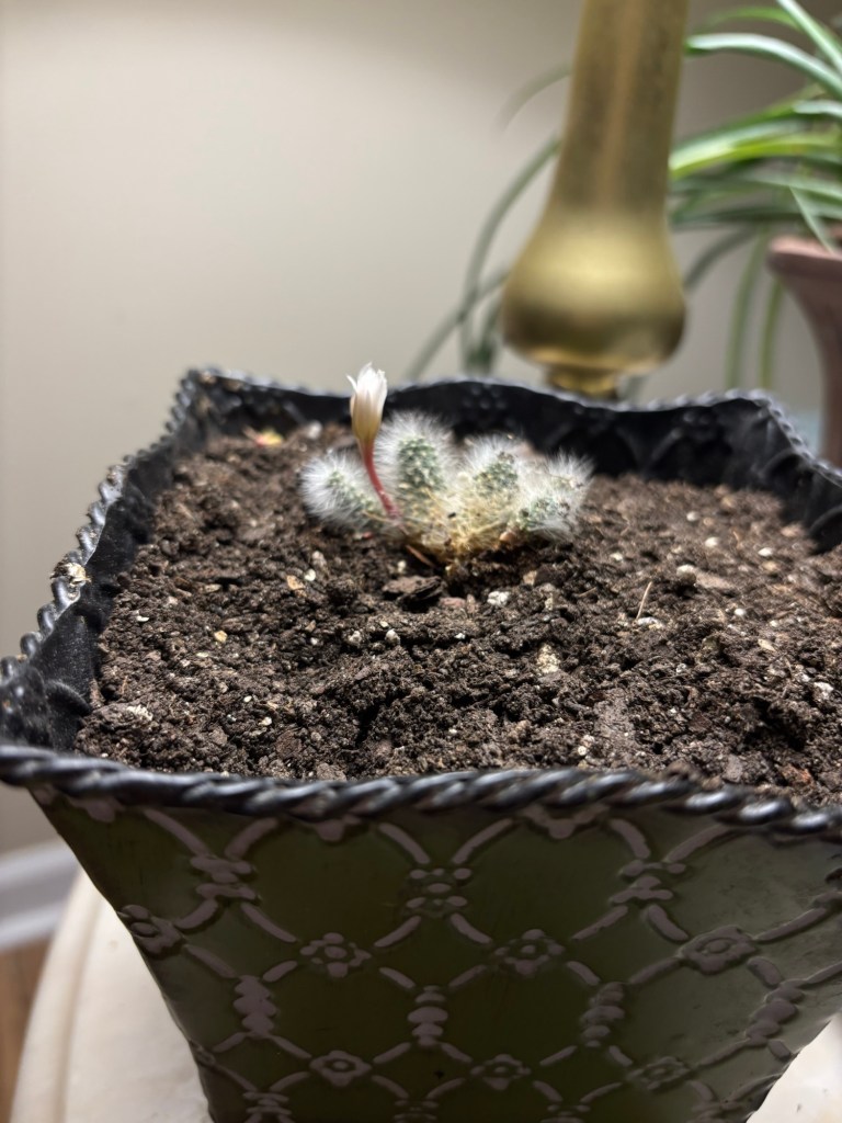 I visited my youngest sister a few weeks ago. Her son showed me a cactus he had that was very small and blooming profusely. I told him I’d like a piece of it, thinking he could get it for me sometime when he repotted it. Instead, he dug out a little chunk and stuck it in a peat pot he had handy.