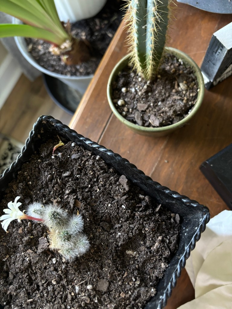 I am not allowed to take care of our cacti. I was allowed to put the little flowering one in its new pot. But, now, I am only allowed to admire them from afar. Chuck picked out the other one for himself and has dared me to touch it.