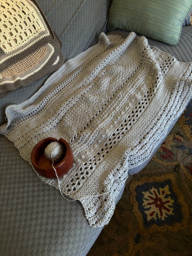 I like having something to do with my hands when we watch TV in the evening. But, I am not consistent. Some days, I do nothing. Some days, I do 10 stitches and put it down. Some days, I get 5 rows done. If there was any question about whether I have ADD, this answers it.