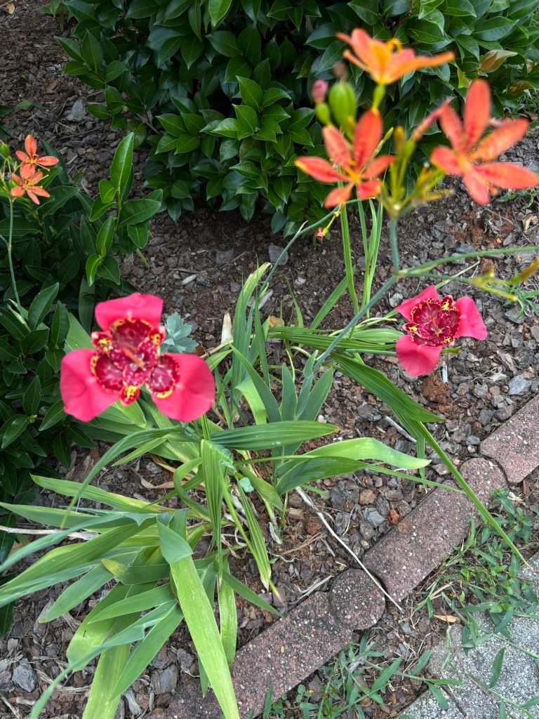 The day before yesterday, a month after that email, I spotted something red in the bed. It was a tigridia. There is a single plant on the left side bed that is blooming. The solitary bulb that has come up on the right side has no buds yet.