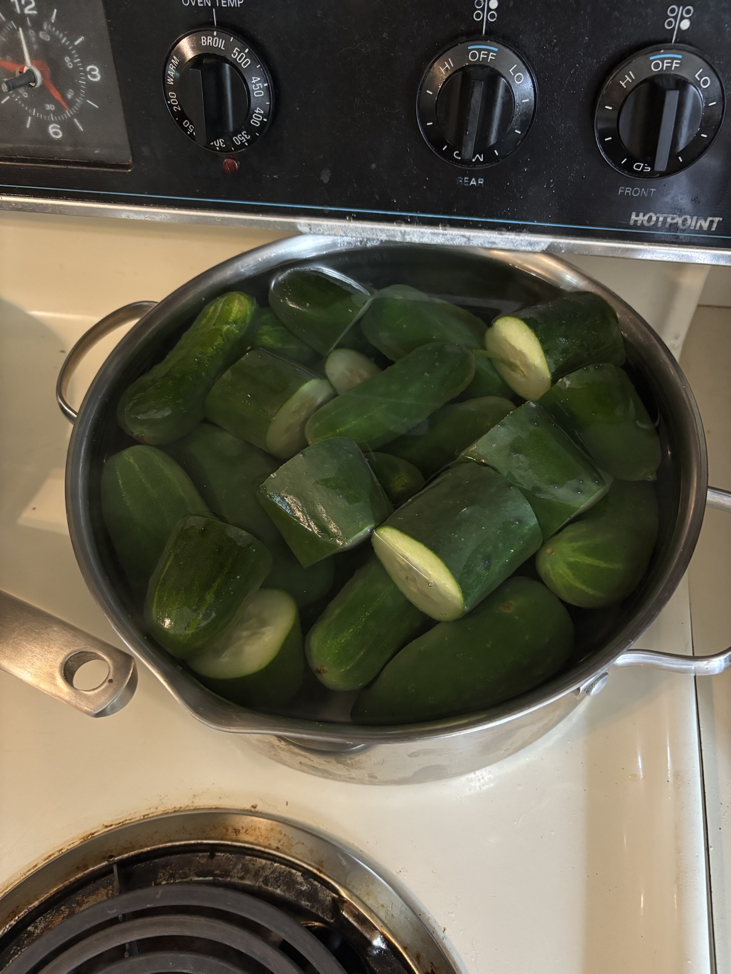 When we went to the farmers’ market last week, there were no pickling cucumbers and I thought I’d missed the window to stock up for the year. So, Chuck ordered some from his weekly vegetable service. Unfortunately, what she sent was 5 large, long cucumbers. My grandmother’s recipe expects them to be whole when you start and these things will not fit my pot. Also, I was afraid they’d be seedy.