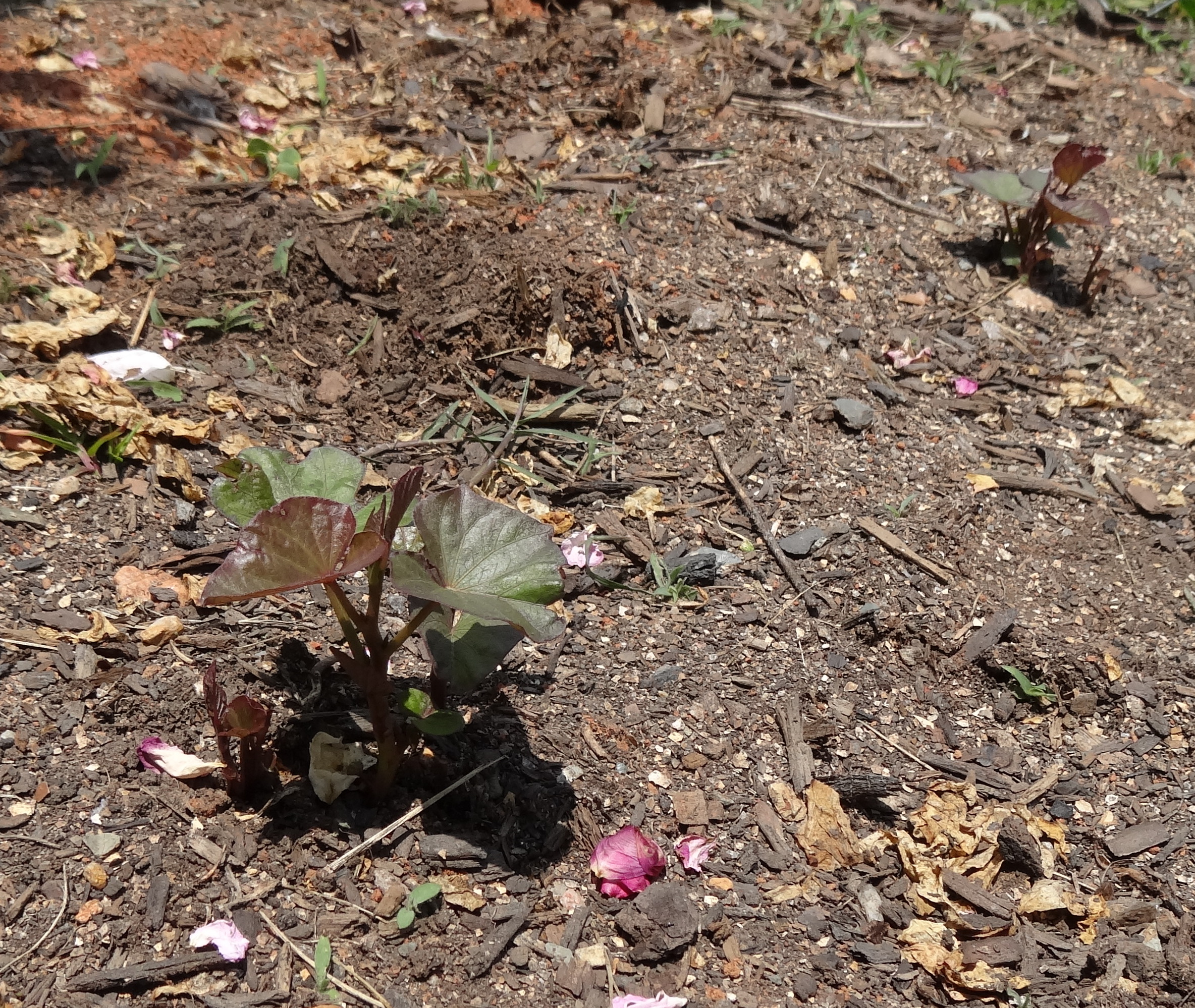 I left them on the table for a little while, allowing them to start sprouting before I planted them. Chuck told me that he understood that sweet potatoes don’t get started the same way white potatoes do, so I looked it up and found out he was correct. I’m finding the slip-starting process frustrating, though. I got the green started on the top, but only one sprout grew with any vigor. It is forming roots in a jar of water, now. I went ahead and planted the potato with roots and teeny , tiny leaves remaining, just in case. And the other bits of leaves are in water, but I don’t hold out much hope for them to do anything. They’re just too small.