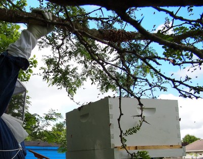 There were a couple of stings and a little attitude, but not nearly as much as the rainy evening we helped Marty split 3 hives. And that’s with Chuck sawing off the crepe myrtle trunk to lift them over the box. In the dark with only a couple of little red flashlights to see by.