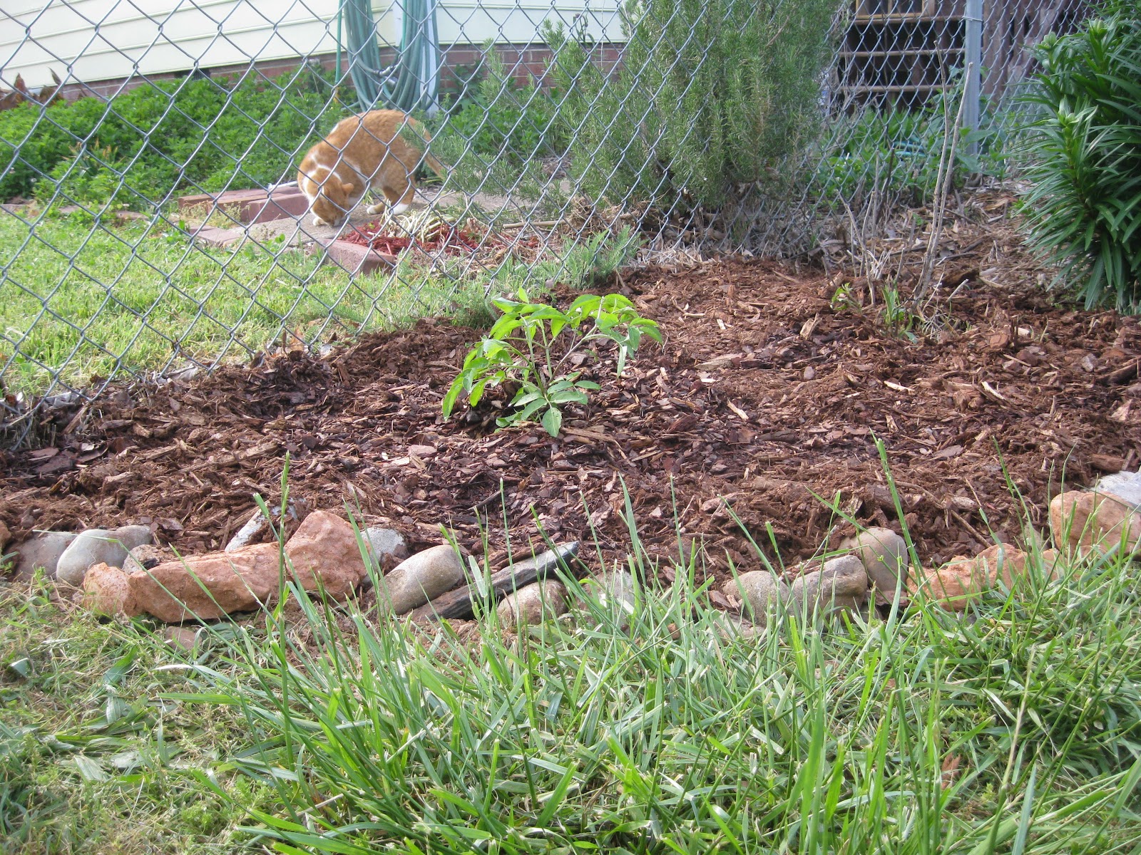 Randy gave me that, too, and I spent the afternoon getting the worst rocks I have ever had to deal with in this yard out of the new bed space. And I had to go back to Southern States, where I only got one bag of mulch for the new bush.