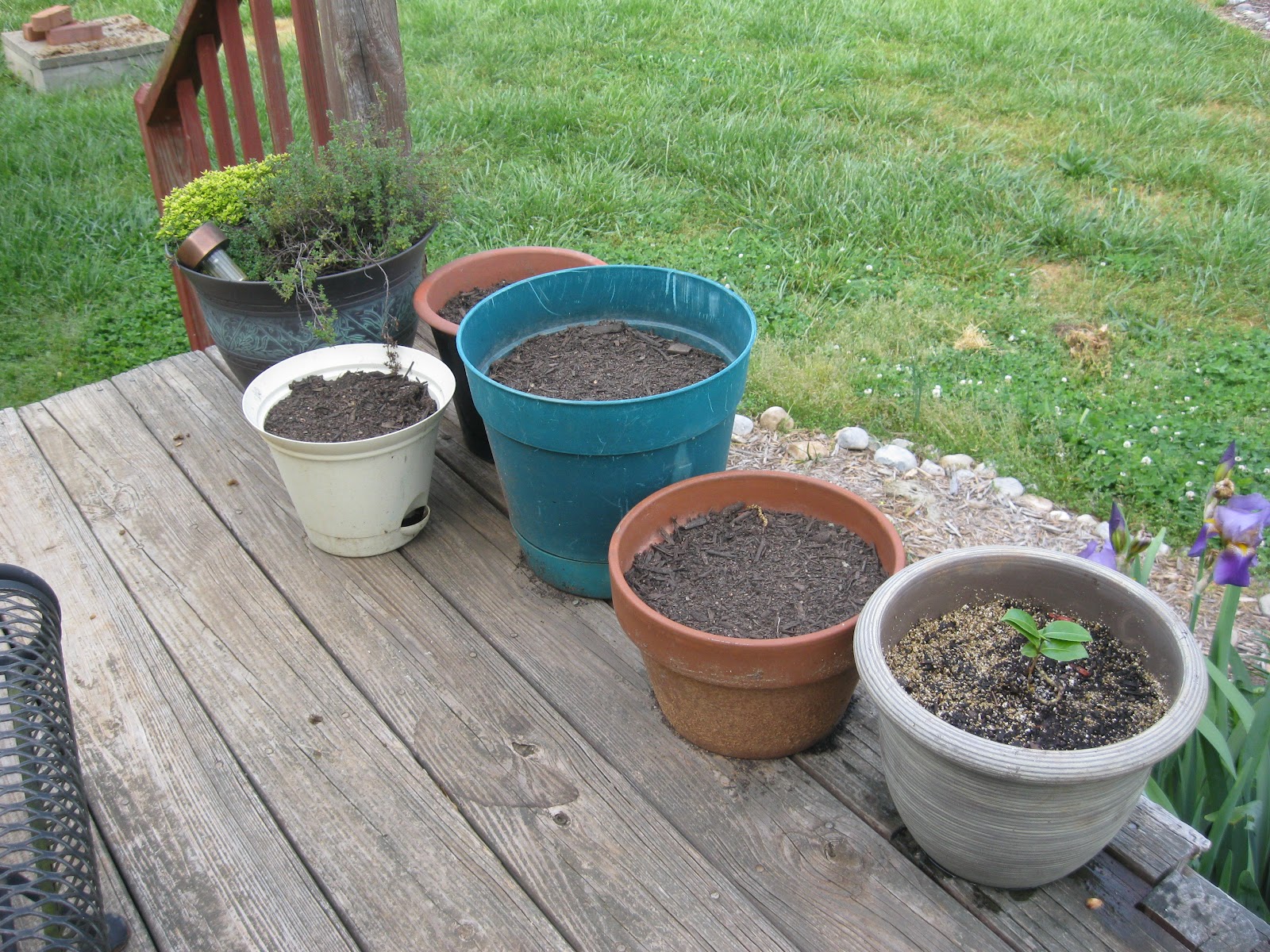 There are seeds in the herb pots. The camellias are in their new pot.