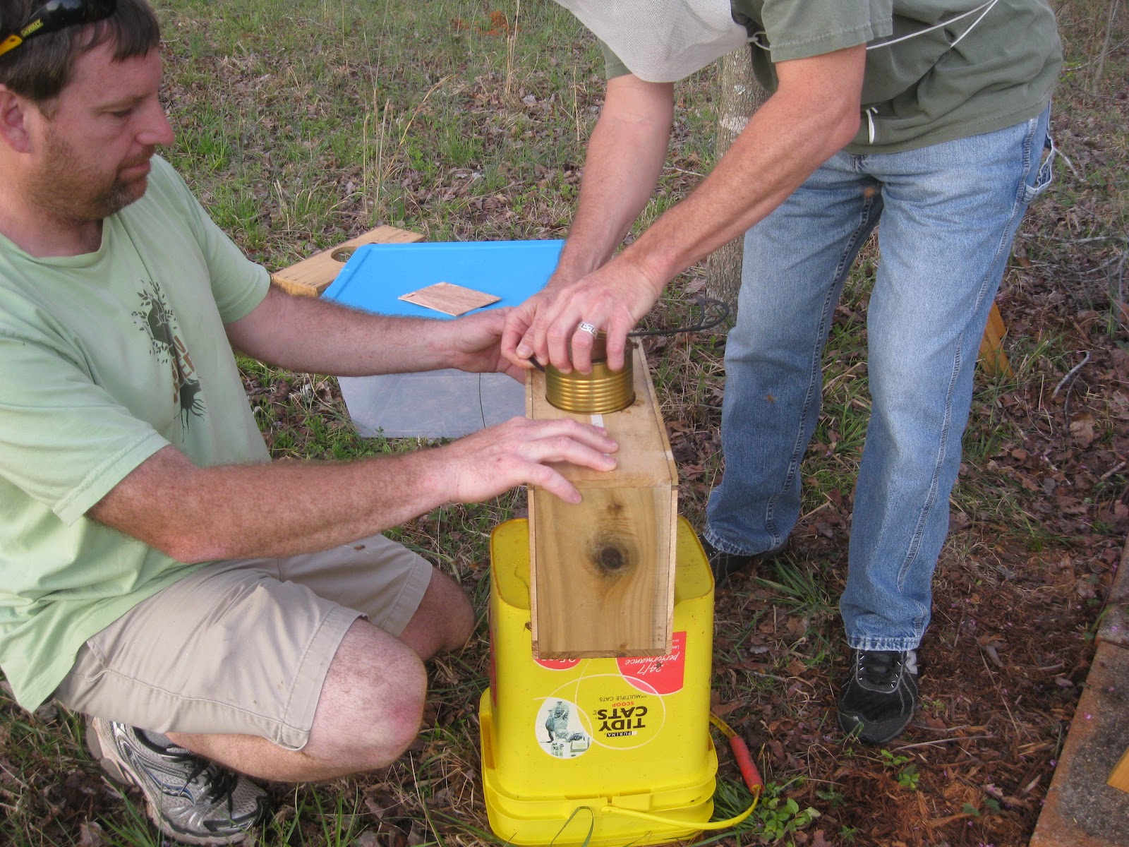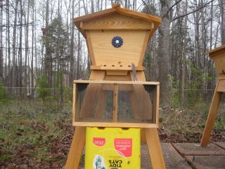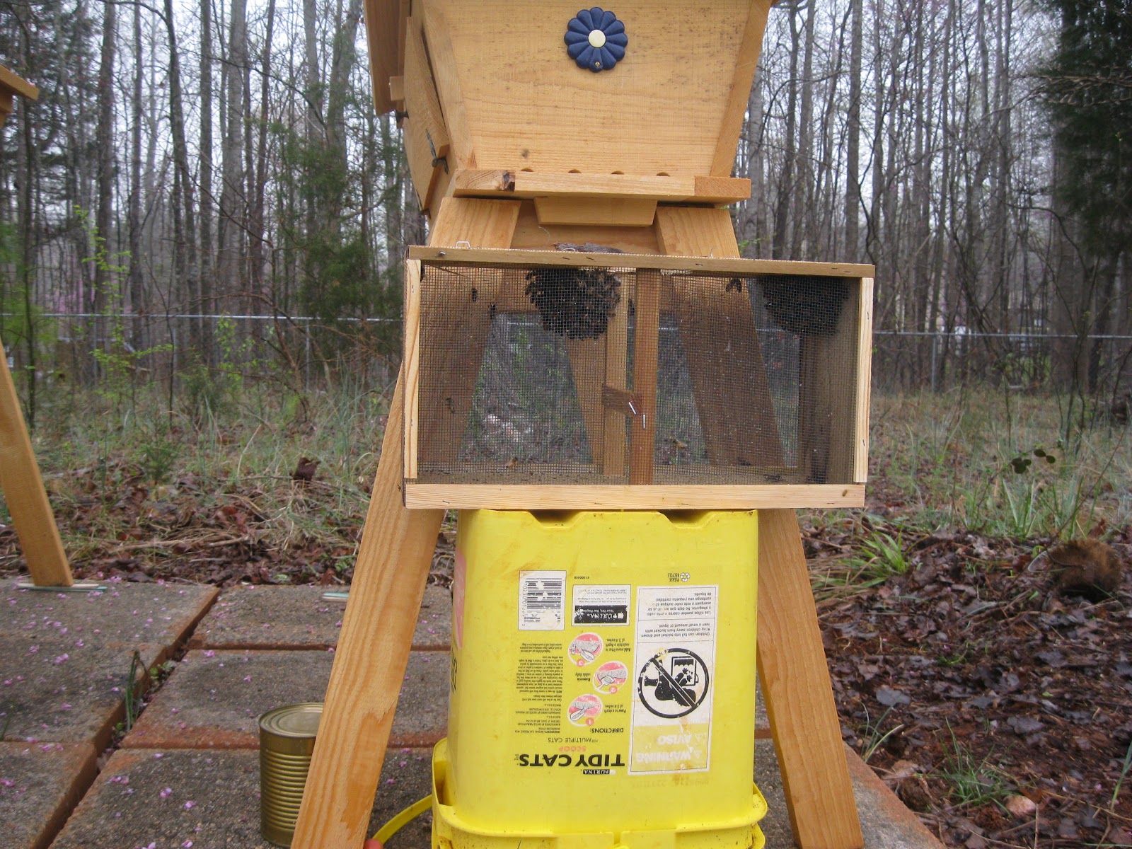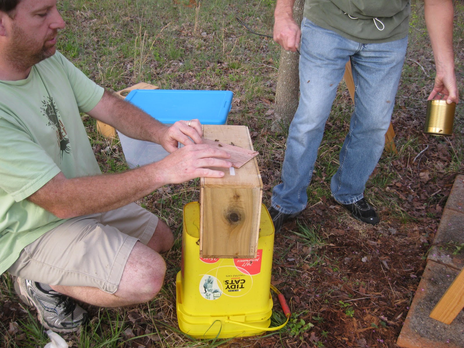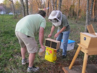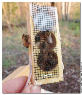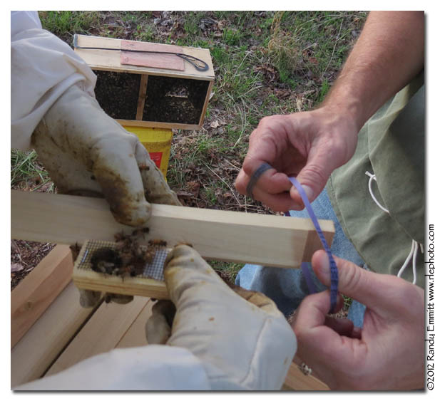 I took a few pictures of Chuck installing one of the packages, but hadn’t thought to recharge my camera battery and it crapped out on me. I was relieved that Randy was taking pictures, too. In particular I loved that he got a good shot of the queen cage. (I think of it as her carriage.) I had expected it to have just the queen in it, but she had 5 or 6 attendants with her.