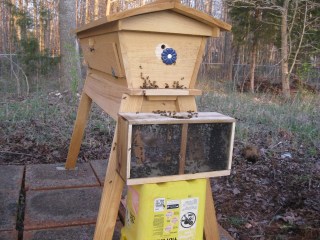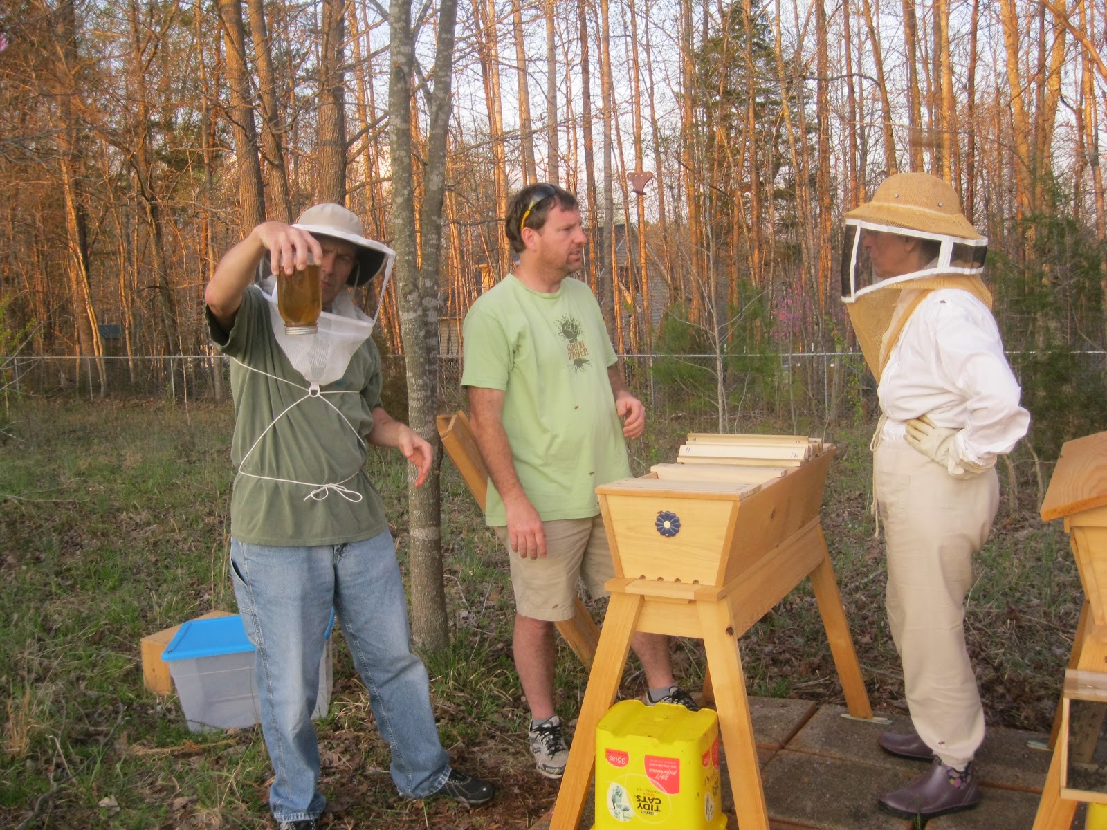 This is Chuck holding up a jar of bee syrup so he can see that it is dripping out slowly.
