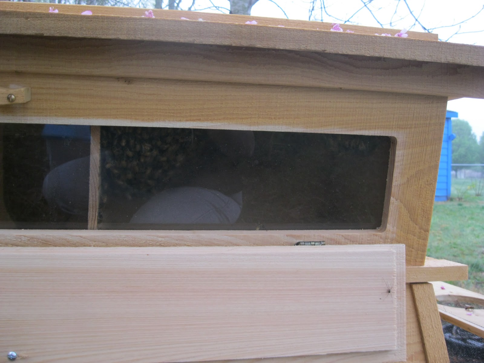 And here is the larger cluster, up against the back board, before getting started on their day. The board is to encourage them to start with a smaller space initially. We’ll remove it tomorrow when we open the hives to be sure the queens are out of their cages.