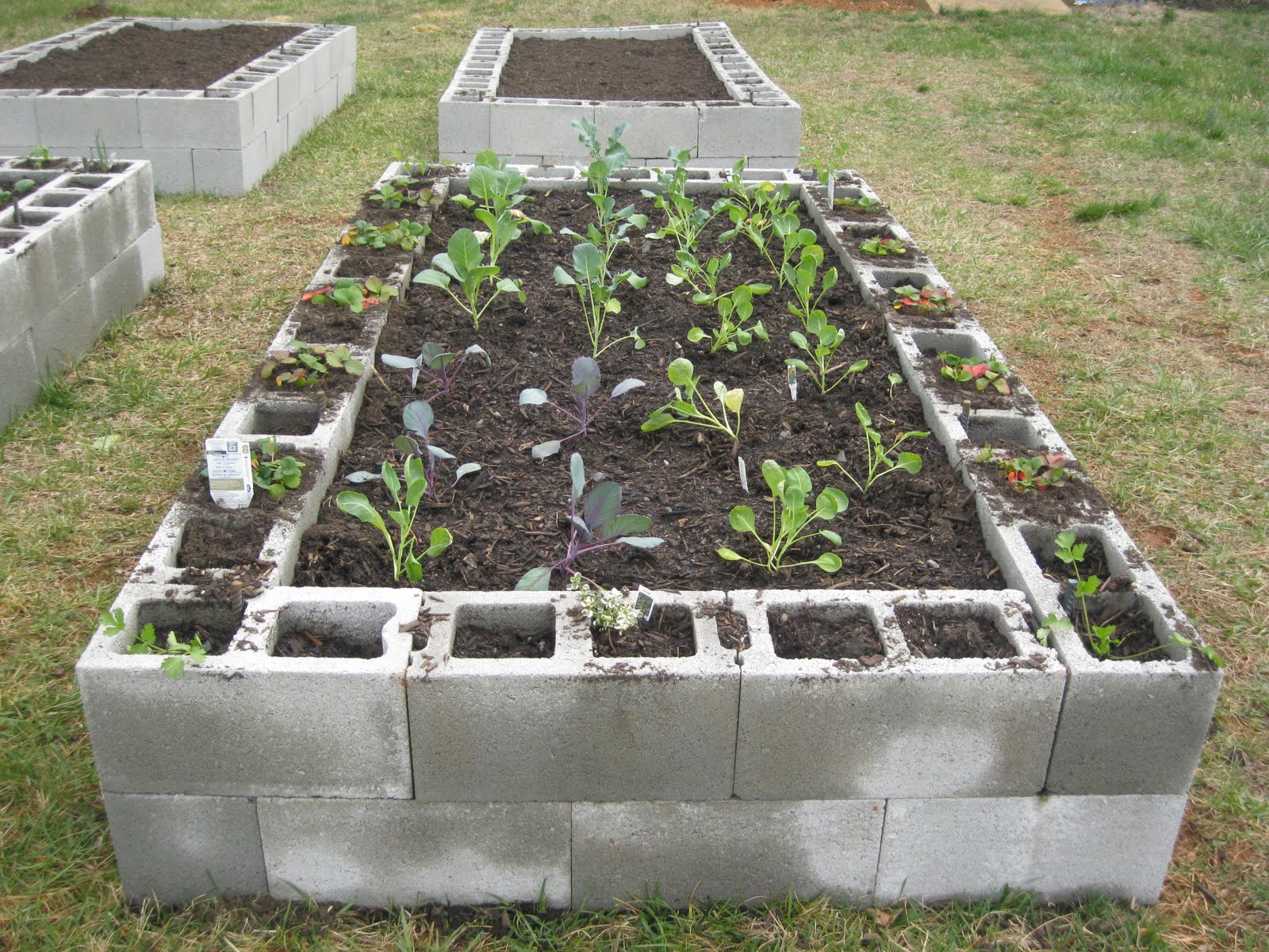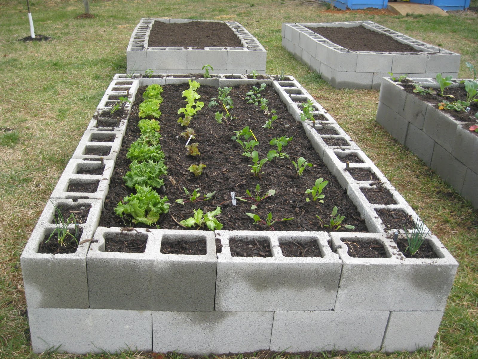 Three nasturtiums have shown up in the holes on the outside edge of the left front bed. Cilantro seeds in the back holes of the front right bed and basil seeds in the back holes of the front left bed. Still waiting for sprouts.