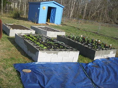 Blocks all stacked, cardboard layer on the bottom, home grown compost scattered around, pine mulch layer spread and watered.