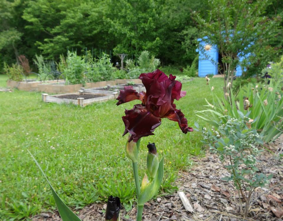 This is a picture I took when my backyard looked different than it does now. But, I love all of it. The iris is ‘Red Hawk’ and those raised bed were overwhelmed by trees-of-heaven, which is why we are using the water troughs, now. Also, I loved the bright blue shed. But, it looked stupid when we had the house resided. So, it is no longer that color.