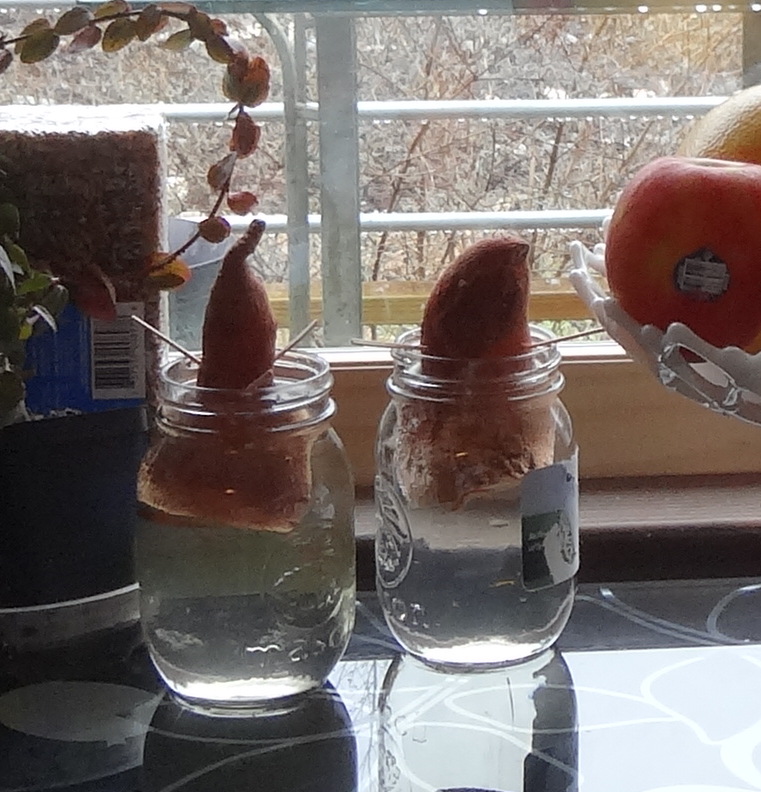One of the sweet potatoes I grew last year is shriveling. So, I have cut it in half and stuck it in water. Maybe I will have 2 pieces ready to go in the ground when it’s time.
