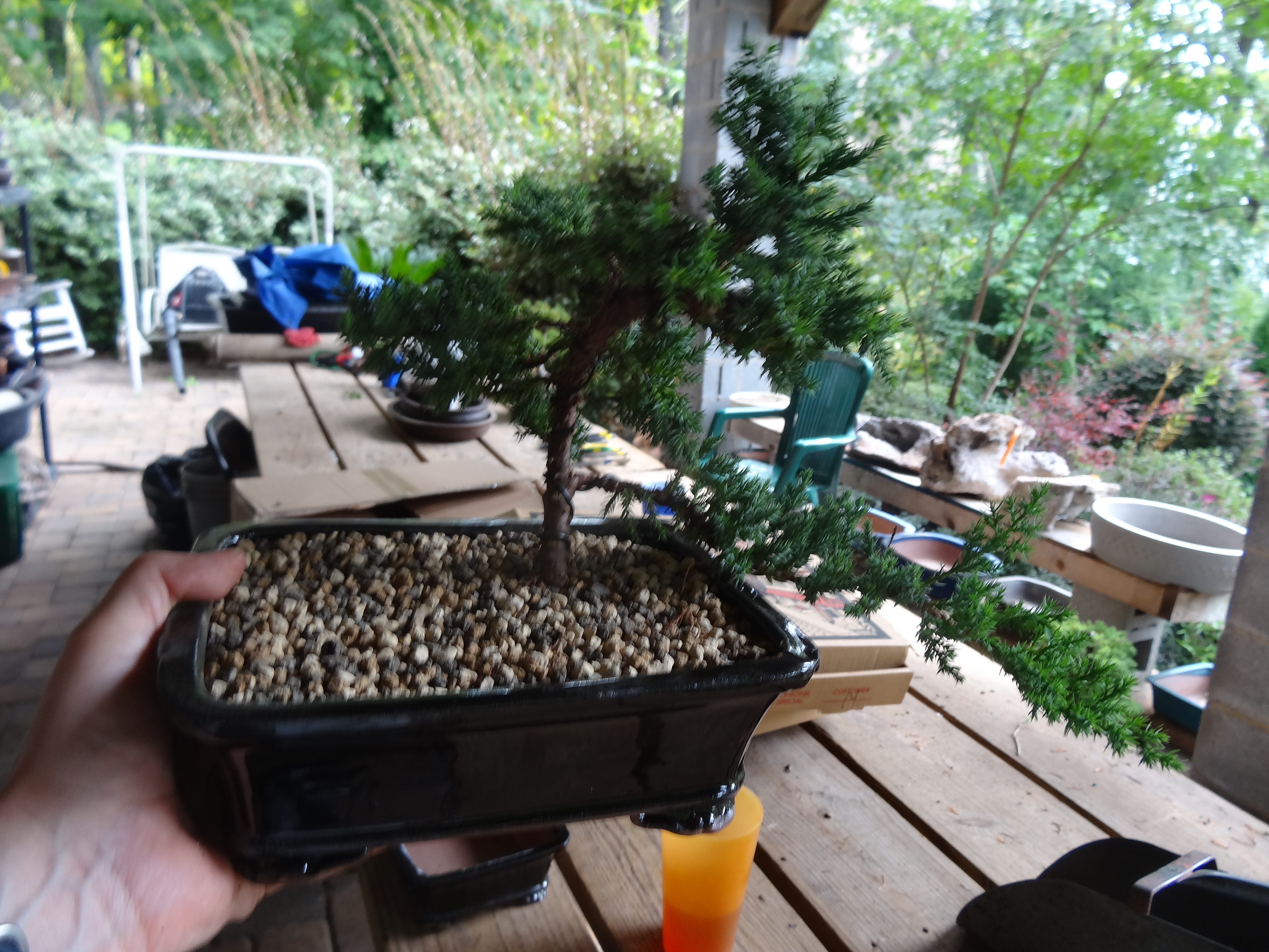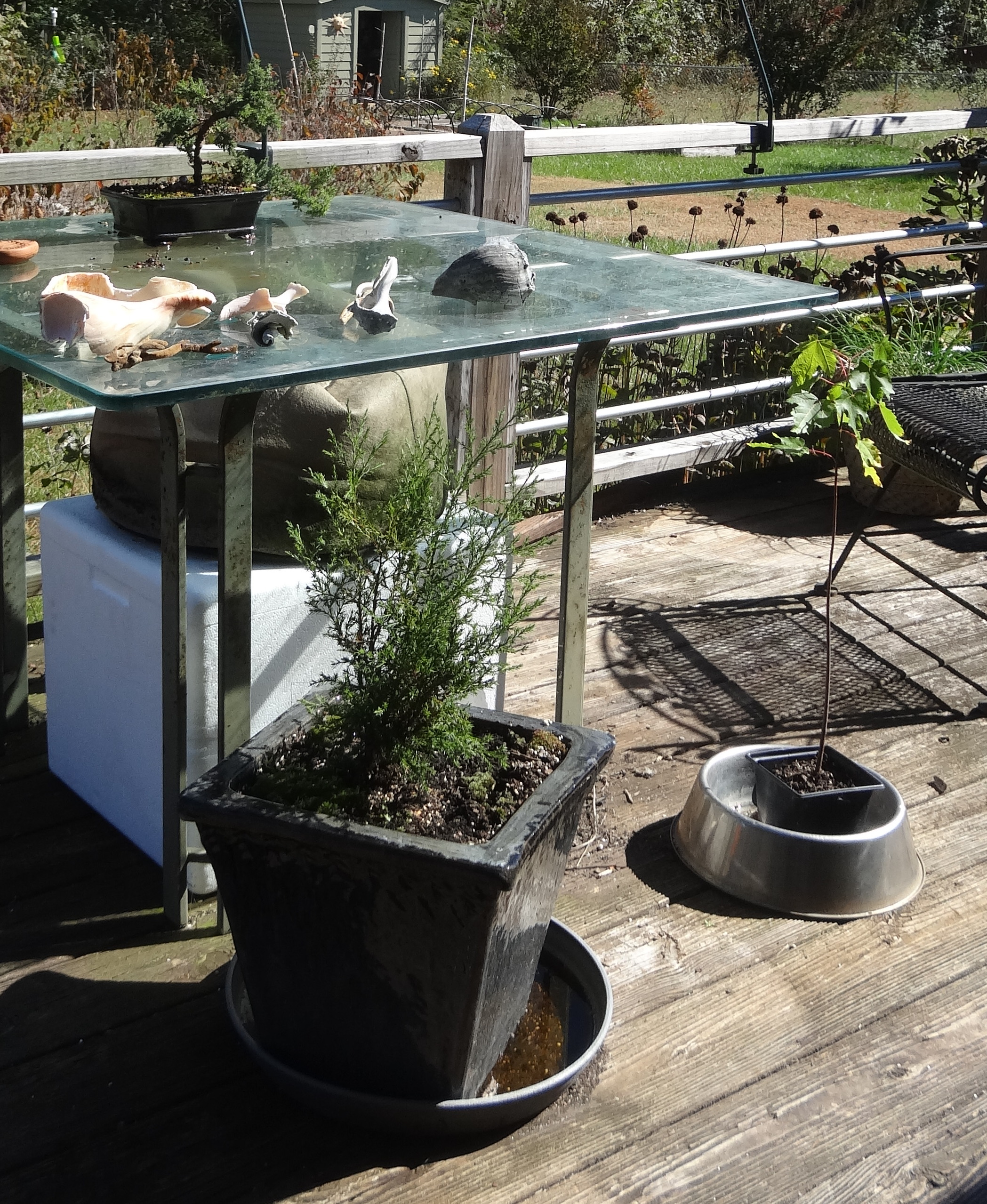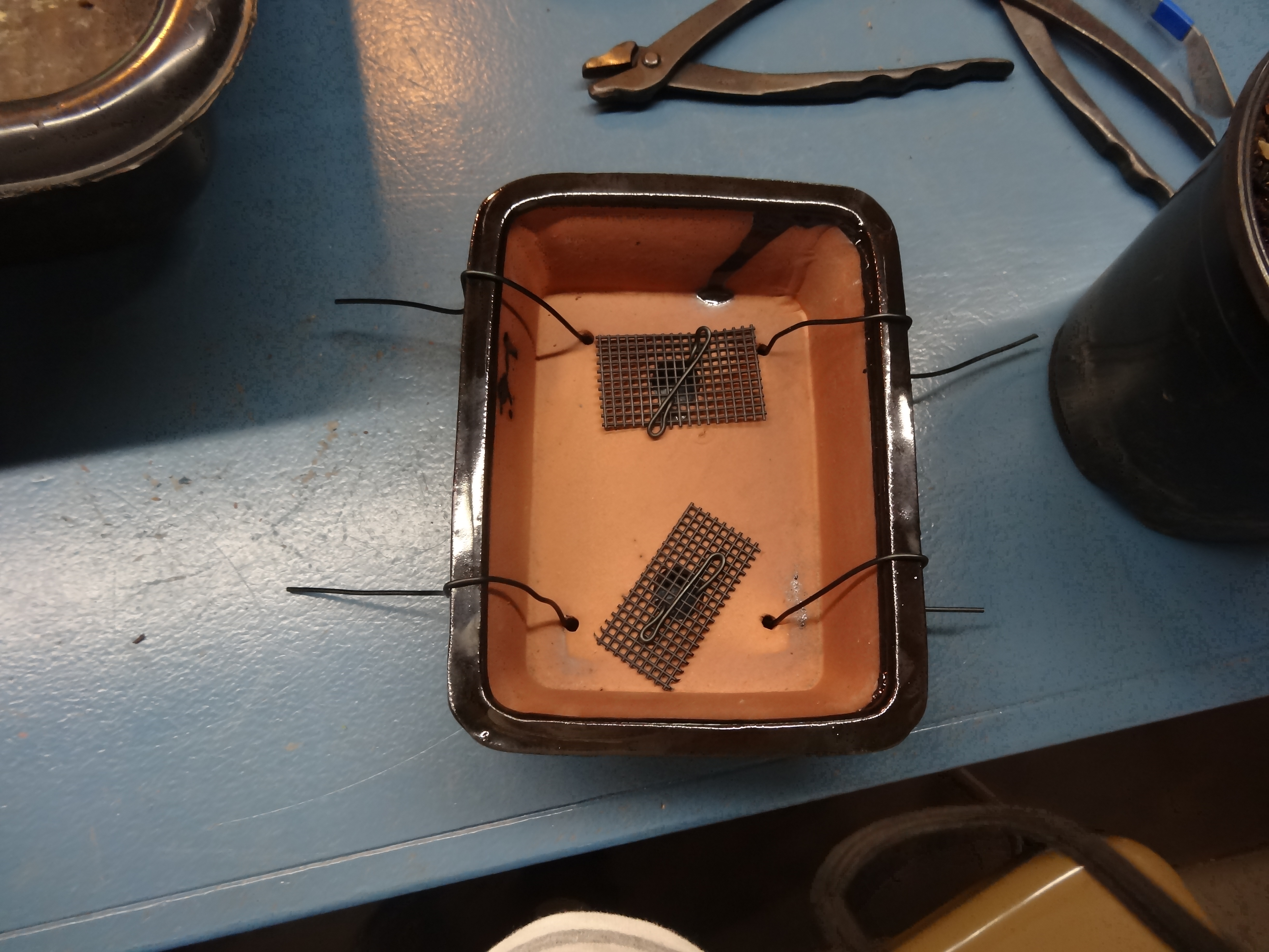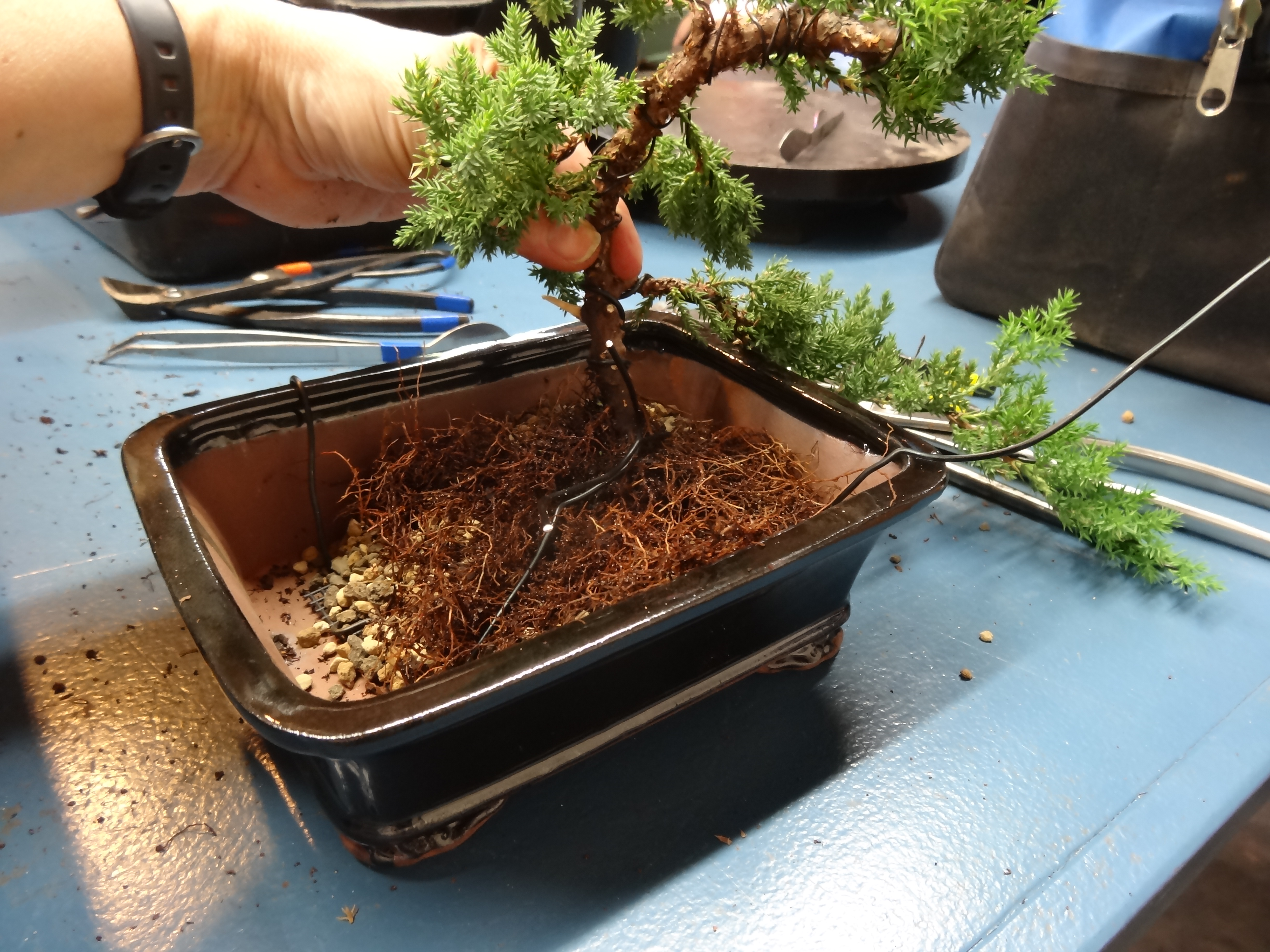 I took a workshop at the Bonsai Learning Center in Mooresville, NC this past Sunday. We were given instruction in the morning and created our first trees in the afternoon. I learned many things. The most intriguing was that the roots are wired into the pot. Somehow, I had missed that memo.