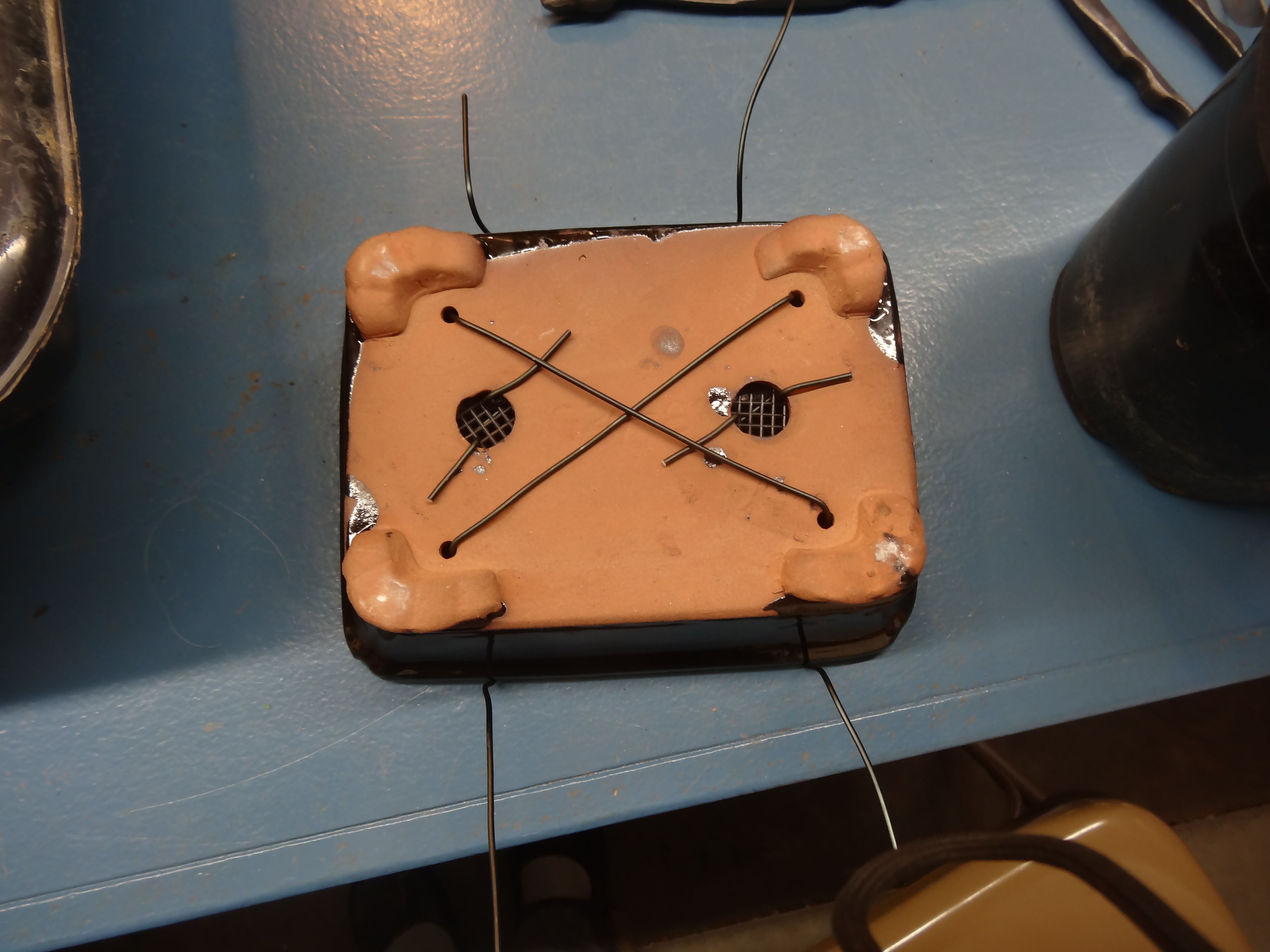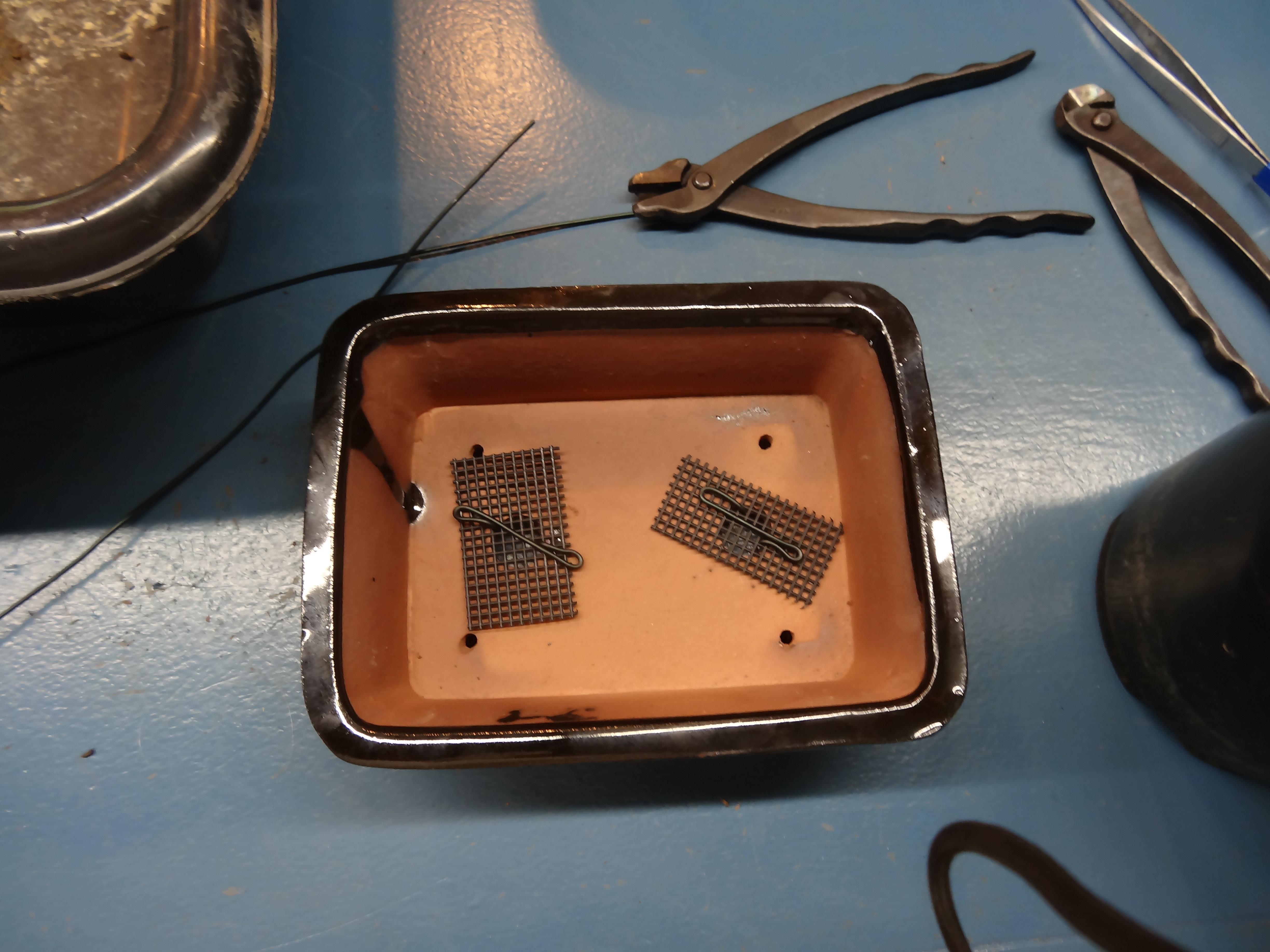 You make a kind of squashed Z and then bend the ends perpendicular to the part that sits on top of the screen in the pot. Ends of the Z have to be wide enough to reach across the hole and hold the screen down. The ends go through close to the edges of the hole.