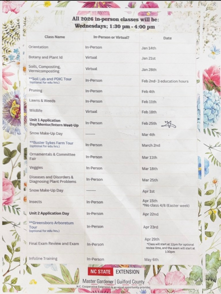 Orientation is January 14 and we will have class nearly every Wednesday until the beginning of May.