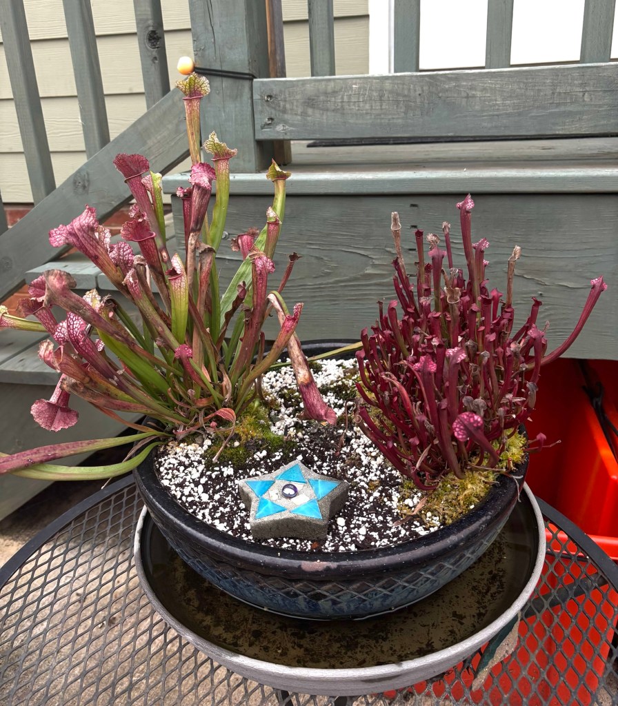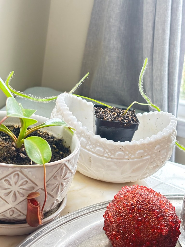 I have carnivorous plant pot dilemmas, too. The Drosera binata is in the little plastic pot I bought it in and it’s still very small. I think it can stay there for a while. But, it’s not particularly attractive. It needs to keep its feet wet and I have it sitting in a milk glass dish that was given to my parents as a wedding present.
