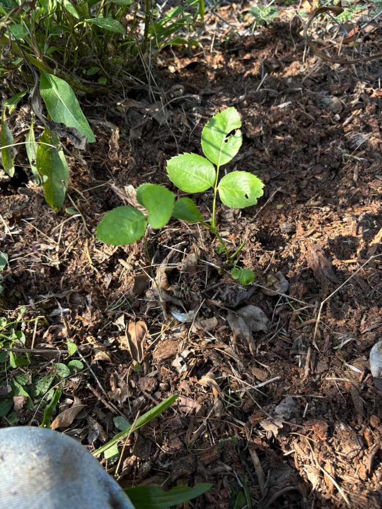 SO. I started pulling grass out a few days ago and got about halfway in between them before giving my hands a rest. Tuesday, Chuck wanted to clear the cypress vines off the front stoop and I collected a handful of seeds to put between those roses. (That may have been a bad idea. They do tend to swallow whatever they’re near.) Yesterday, I finish pulling the grass around and between them, outlined that spot with some edgers I had lying around and mulched fairly heavily. I’m considering another load of mulch.