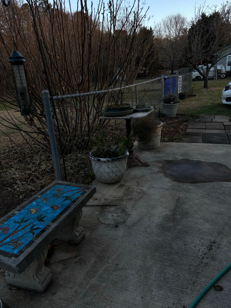 Giving myself credit for a good day’s work, I shifted the stepping stone I’d stashed under the stoop to the spot where we’ve set up the Solo Stove so I could use the edgers Chuck had appropriated for that and I moved the tall marble garden table farther along the patio, putting it more in the sun. I keep swapping out the carnivores and the bonsai from there to one of the other tables on the patio and I think that’s better placement for whatever plants I have on it.