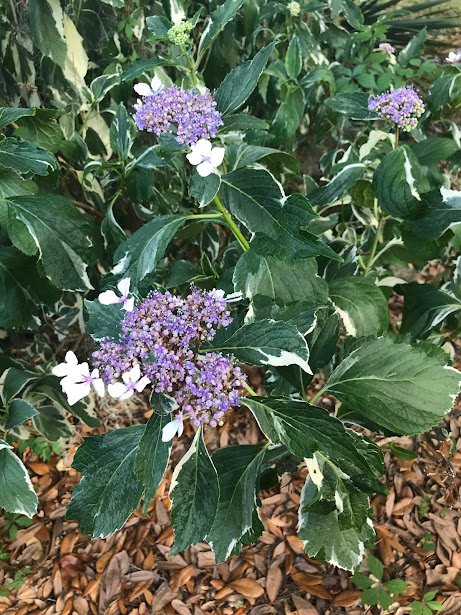 It’s a variegated lace cap hydrangea. See how variegated those leaves are?