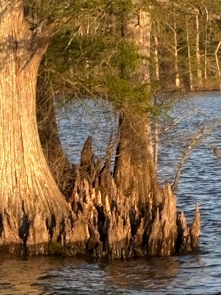 The knees on the bald cypresses growing in and around the sound finally inspired me to look up the cause of that phenomenon. And it’s the water. If the ground ever dries out, the knees stop forming. Clearly, that will never happen to this tree.