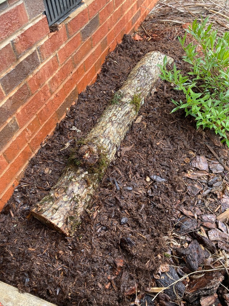 I dug out some of the mostly-clay to set it down in the ground a little and added some hardwood much around it. The clay there isn’t as brick-like as it is in the middle of the yard becuase I’ve been working on that area for a little while. But, it could still use some enhancement. Therefore, mulch.