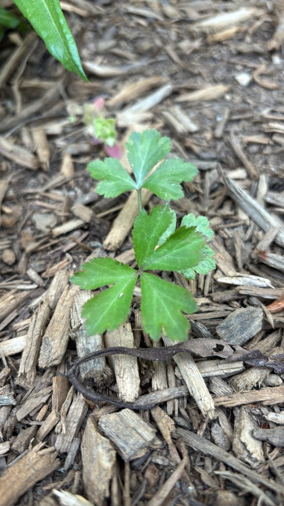 A wild thing has shown up there and I’m not sure what it is. I have Eastern columbines (Aquilegia canadensis) planted in the roadside bed and this looks similar. iNaturalist thinks this is a Black Snakeroot (Sanicula canadensis). Both are native and these leaves look like it could be either one. I’m going to leave them alone for the summer and see what I think later.