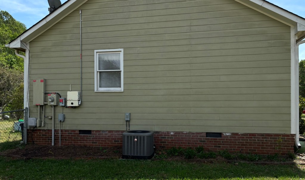 To the right of the HVAC, I have had swamp sunflowers (Helianthus angustifolius). They are native and great Fall food for pollinators. They did moderately well over there, leaning out for the sun. But, only moderately and the lean proves they aren’t in the best spot for them to be happy.