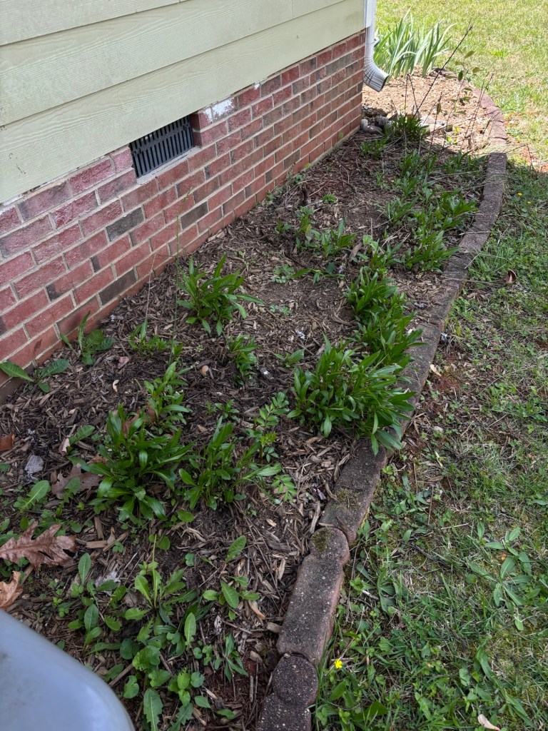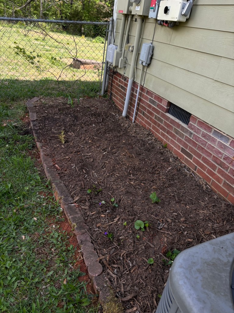 I’ve also been putting wild violets over there. They are growing all over the place and I like them and I don’t mind them spreading around in that area. Some are white with purple throats and some are all purple. As I have removed them from other beds, I’ve moved them to this one.