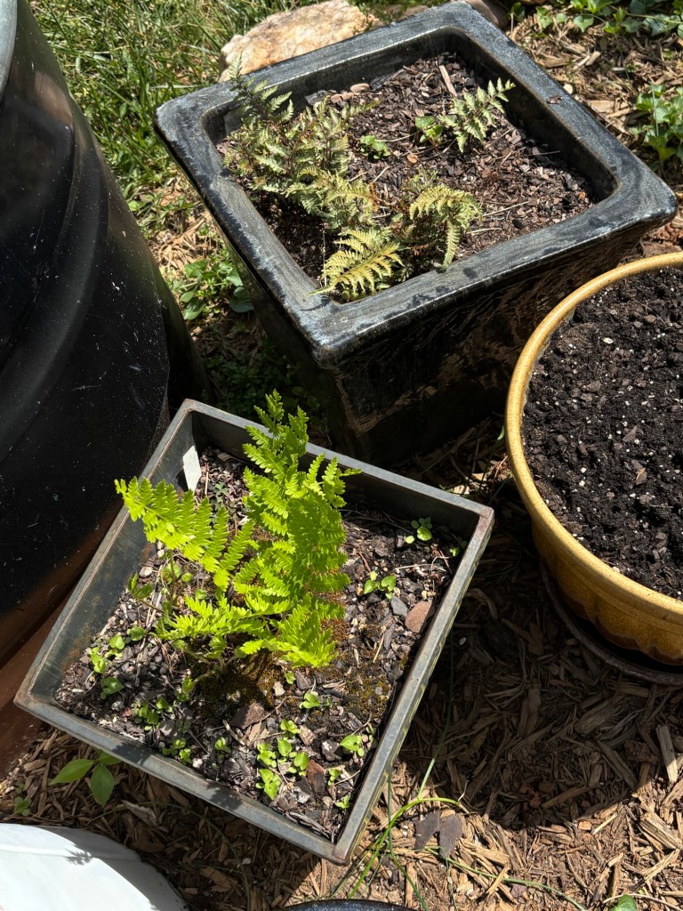 The Japanese Painted fern and the Cinnamon ferns are doing well in their pots. I would like to put part of them in the shade garden. But, I also like seeing them off the patio. I think I’ll wait until they start moving into dormancy to put pieces of them over there. That will give me the summer to be sure I’ve cleaned up that bed to my satisfaction and give them winter to get established.
